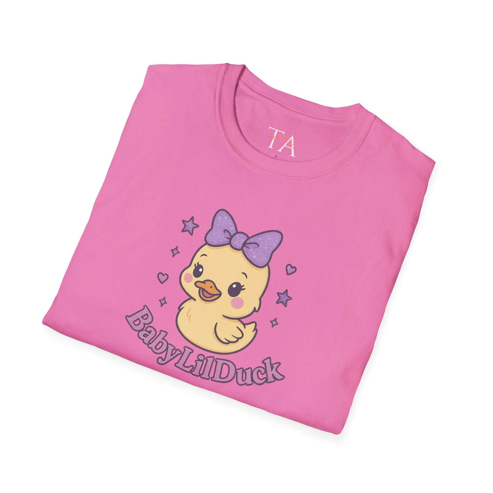 BabyLilDuck Unisex Softstyle T-Shirt, a cute animal tee perfect for gifting at baby showers and birthdays. Made from durable and smooth fabric, this shirt is designed for adults and offers a classic fit with a versatile style suitable for any occasion.
