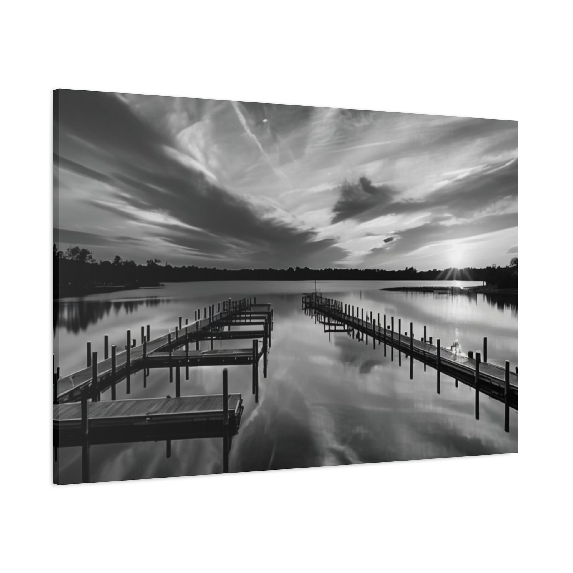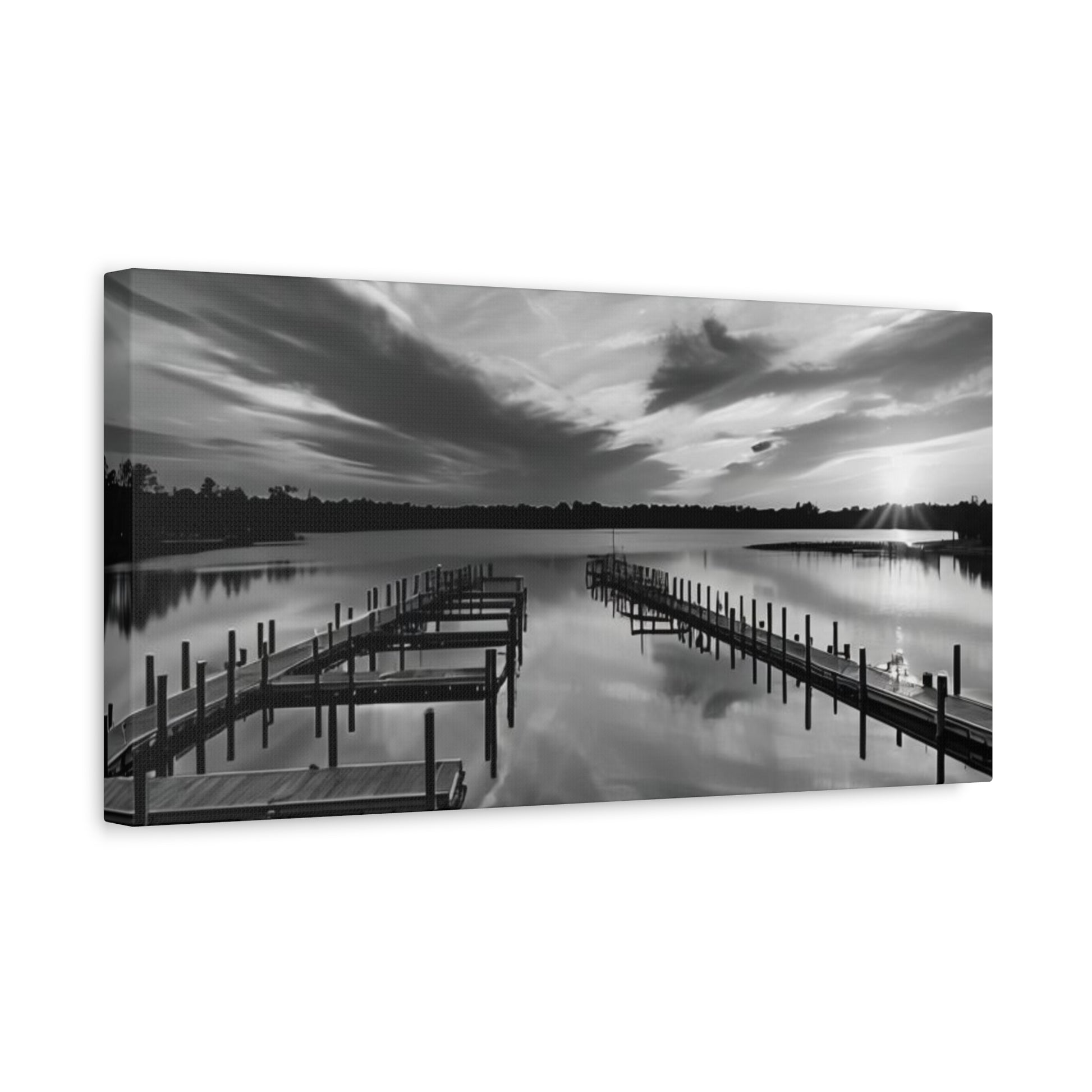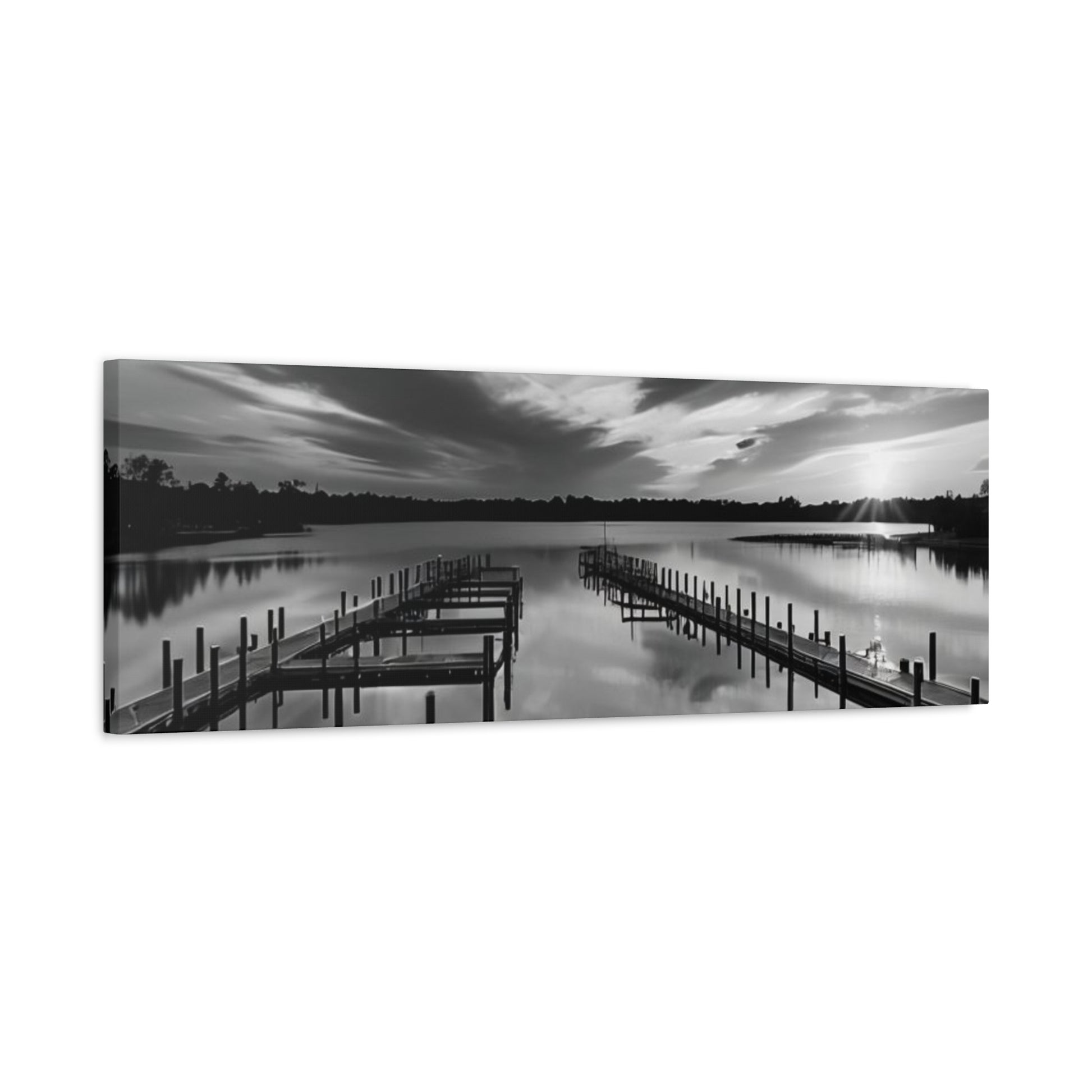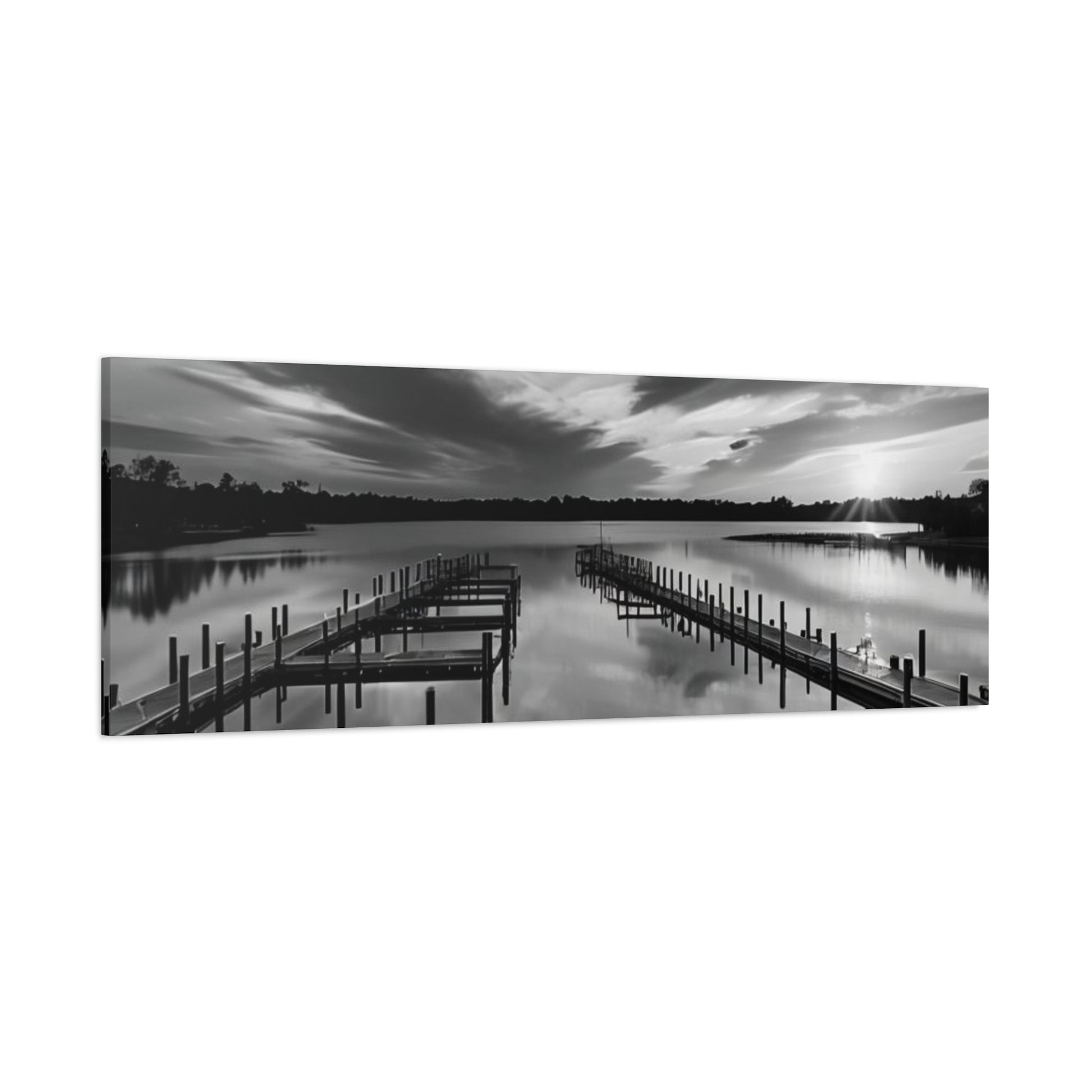 Serene Black and White Landscape Canvas Wall Art. Experience the calming vibe of overlooking the water at the end of the day.