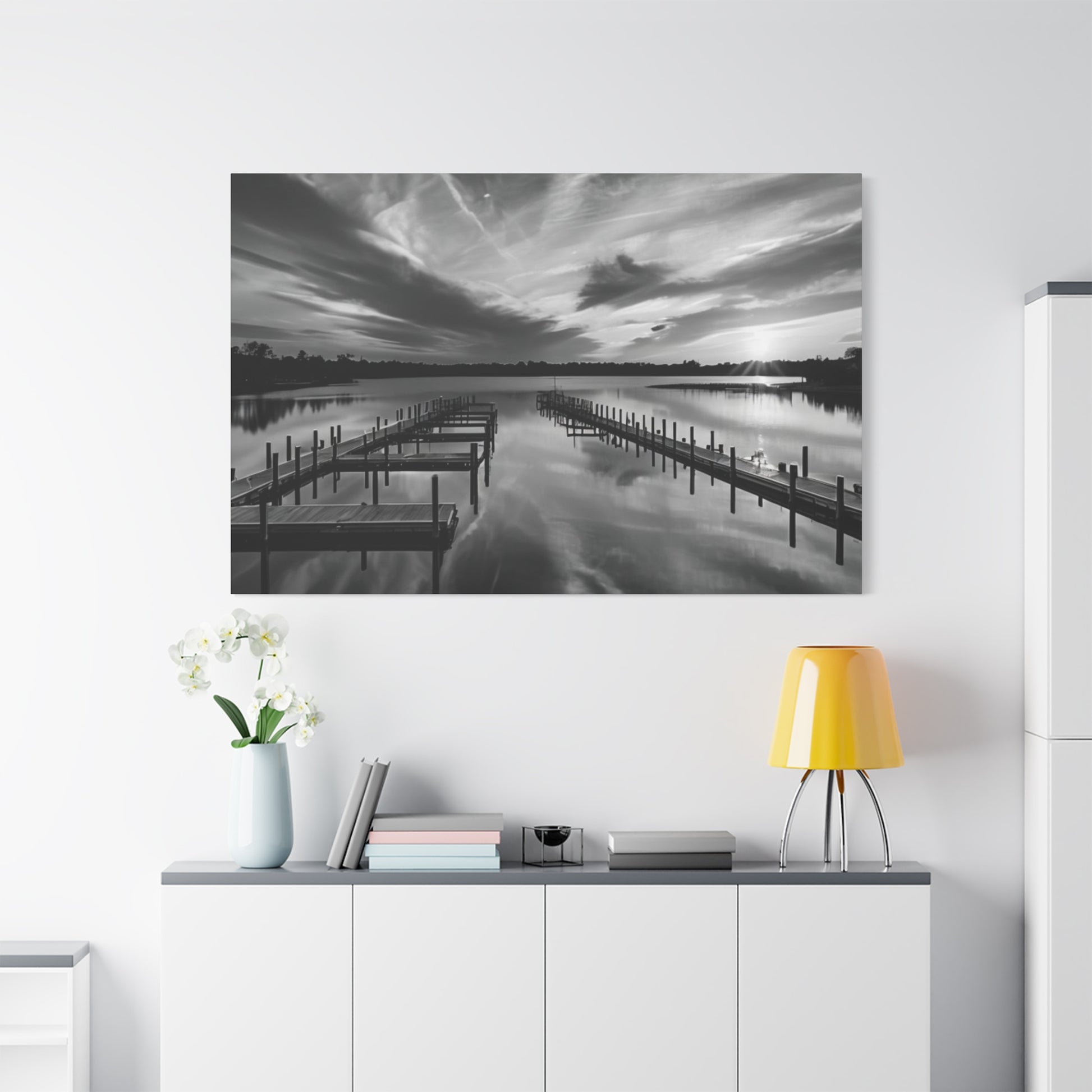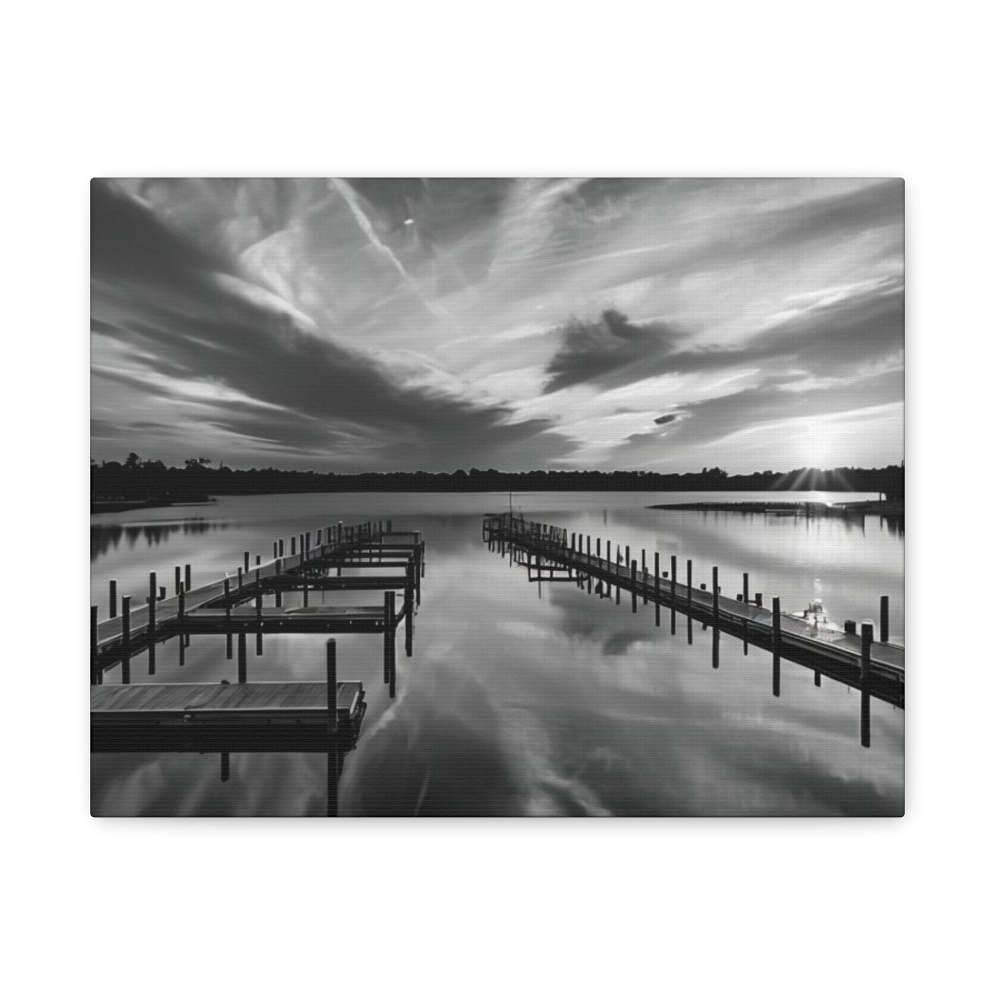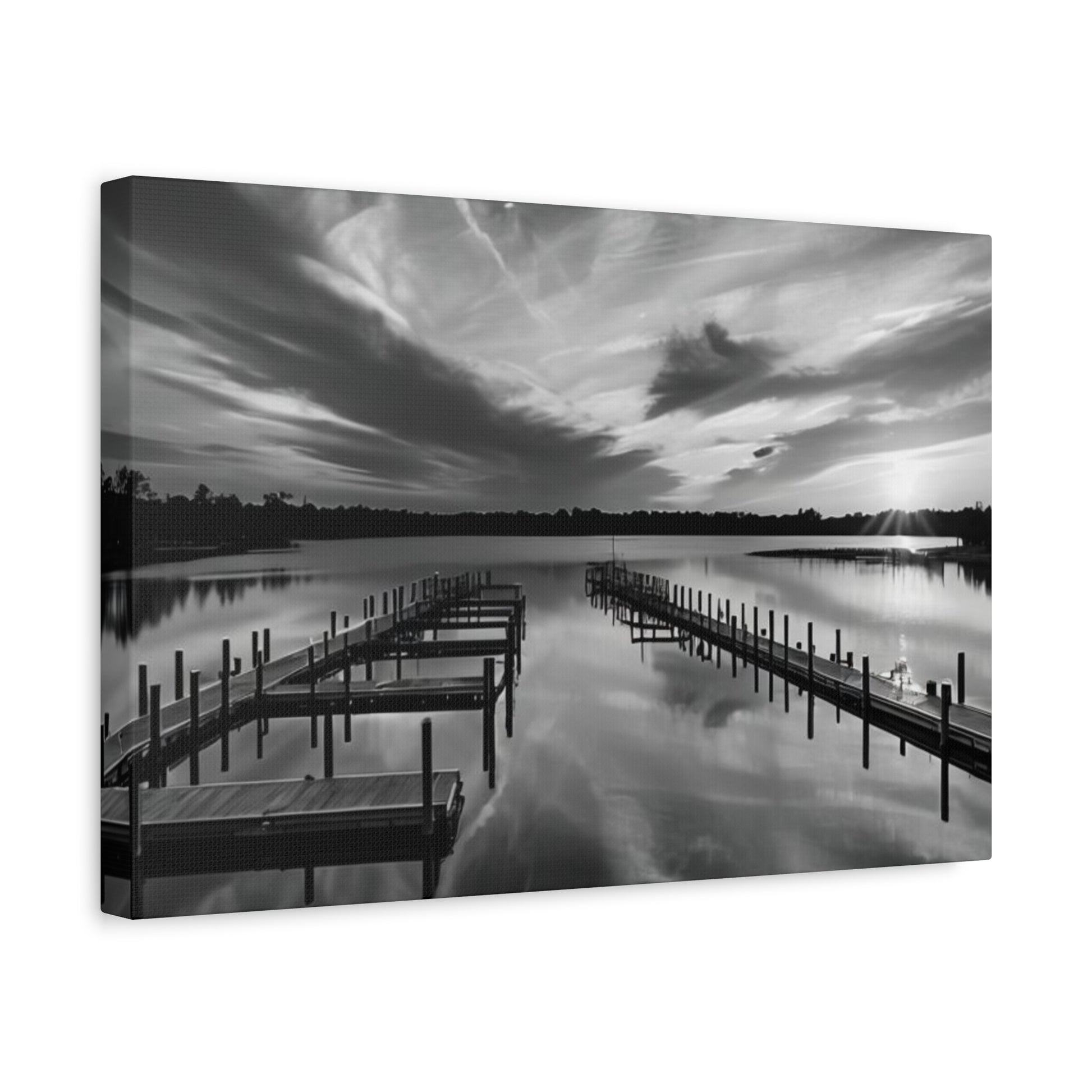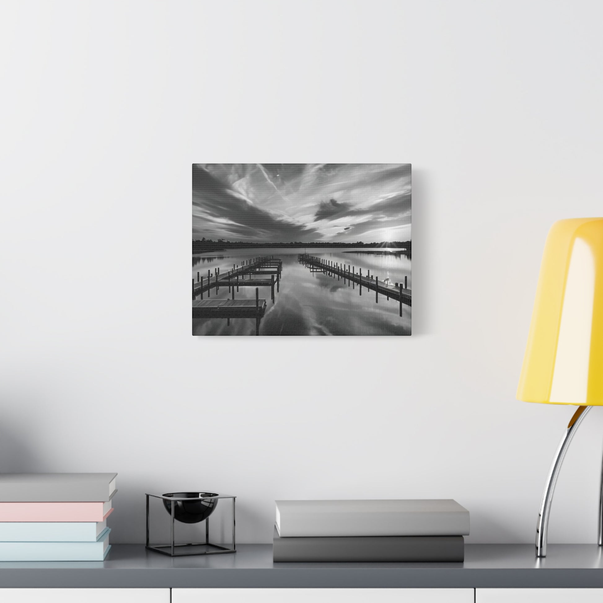 Serene Black and White Landscape Canvas Wall Art. Experience the calming vibe of overlooking the water at the end of the day.