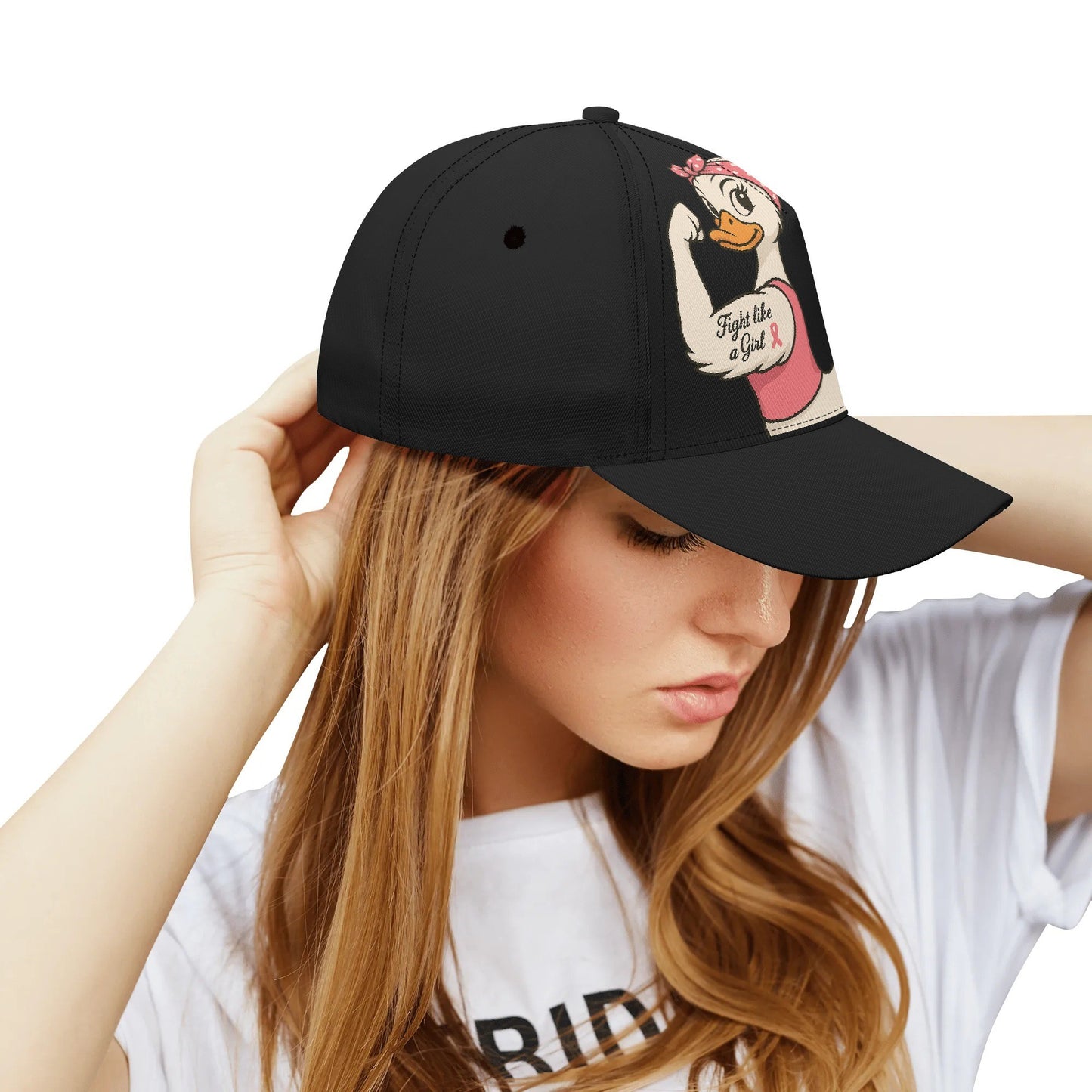 Empowering Advocacy Wear: This high-profile baseball cap features our bold feminist duck graphic with the iconic "Fight Like a Girl" slogan and pink ribbon motif - a powerful statement of solidarity in the breast cancer awareness movement. The Pop Art-inspired design combines vibrant colors with meaningful symbolism, creating conversation-starting headwear for activists and allies.