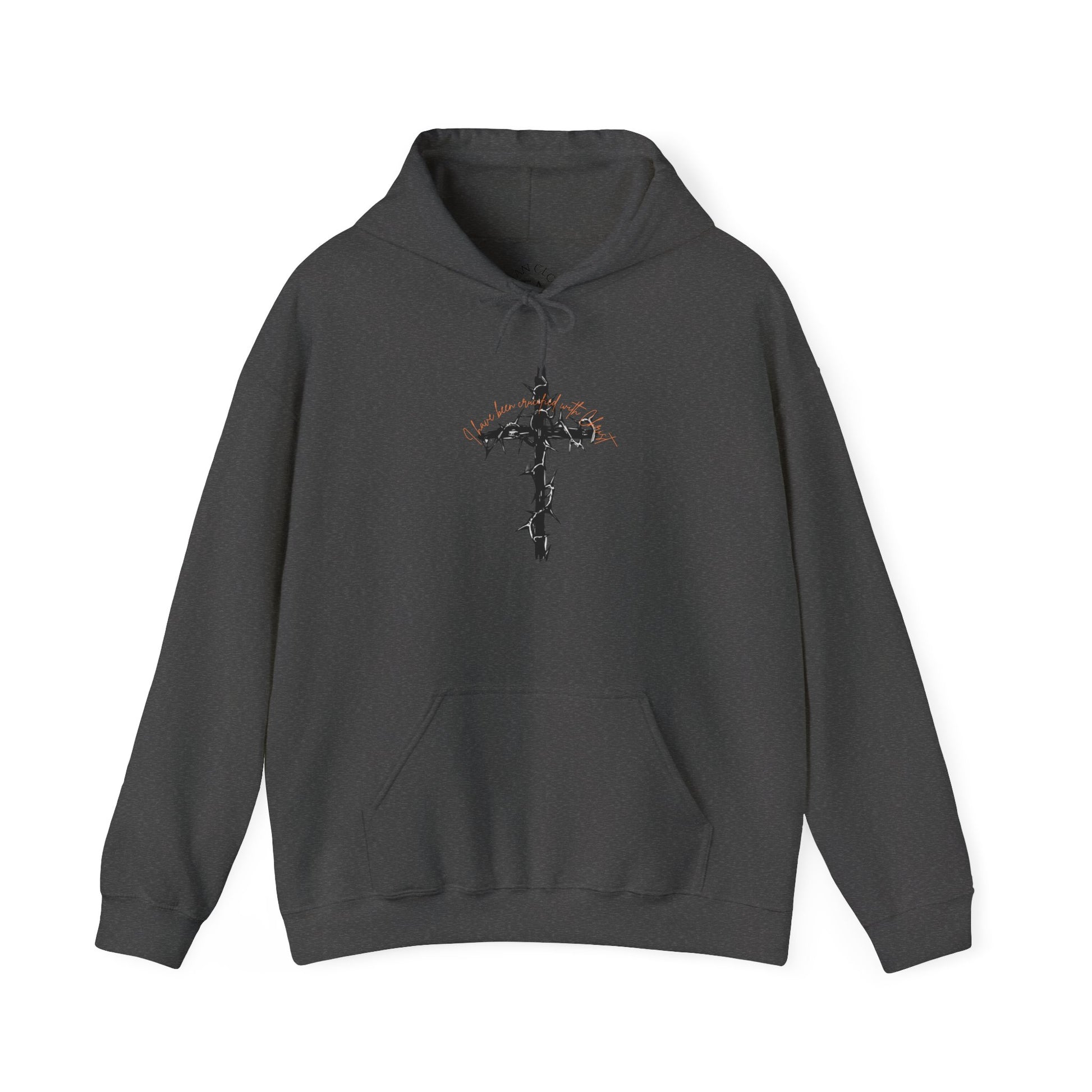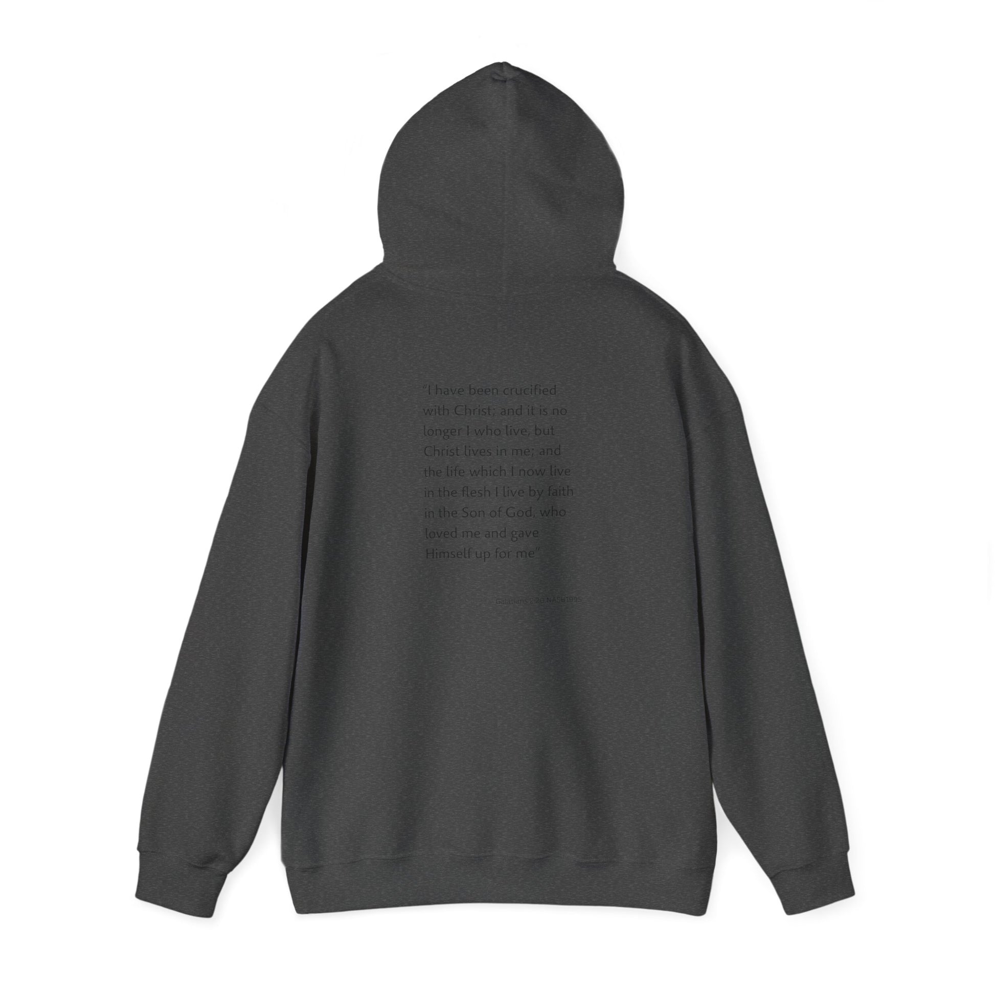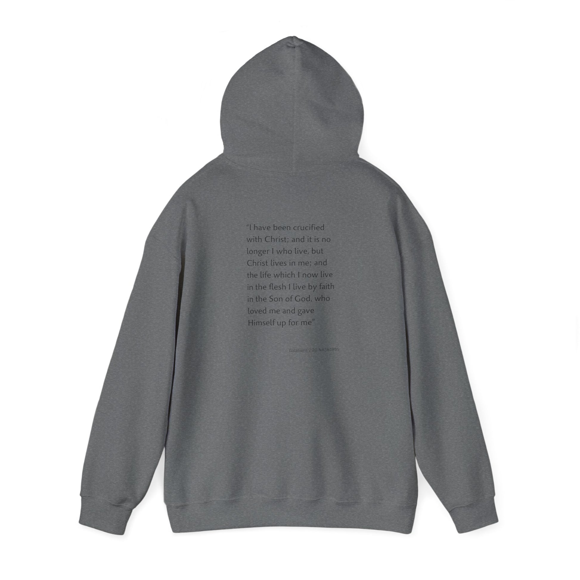 Faith Inspired Christian Cross with Thorns on Front and Galatians 2:20 on back Hooded Sweatshirt