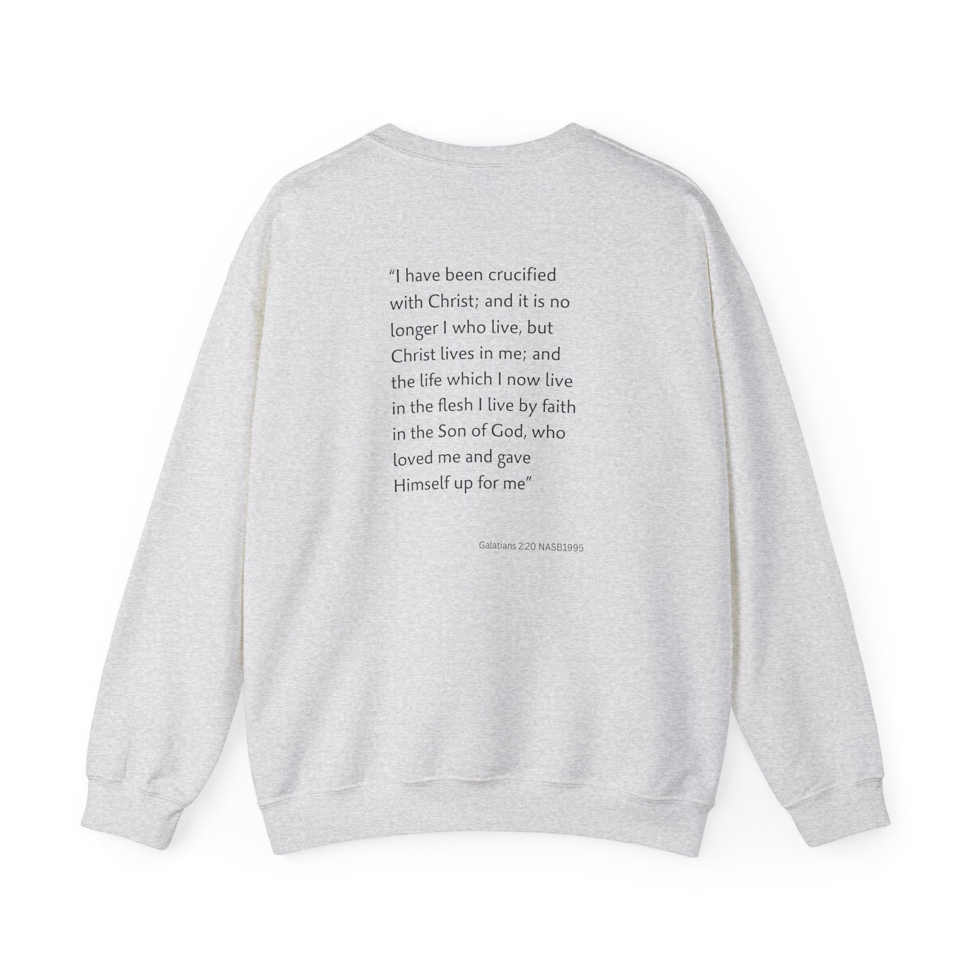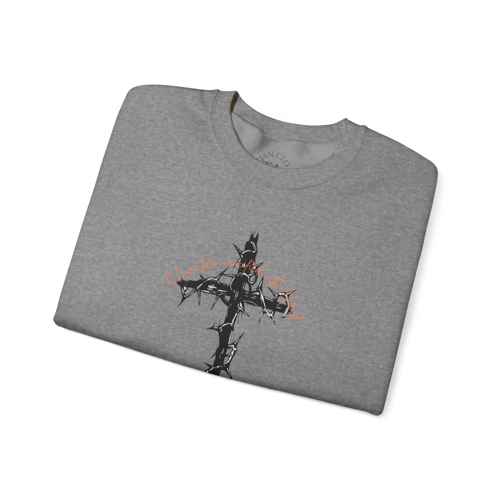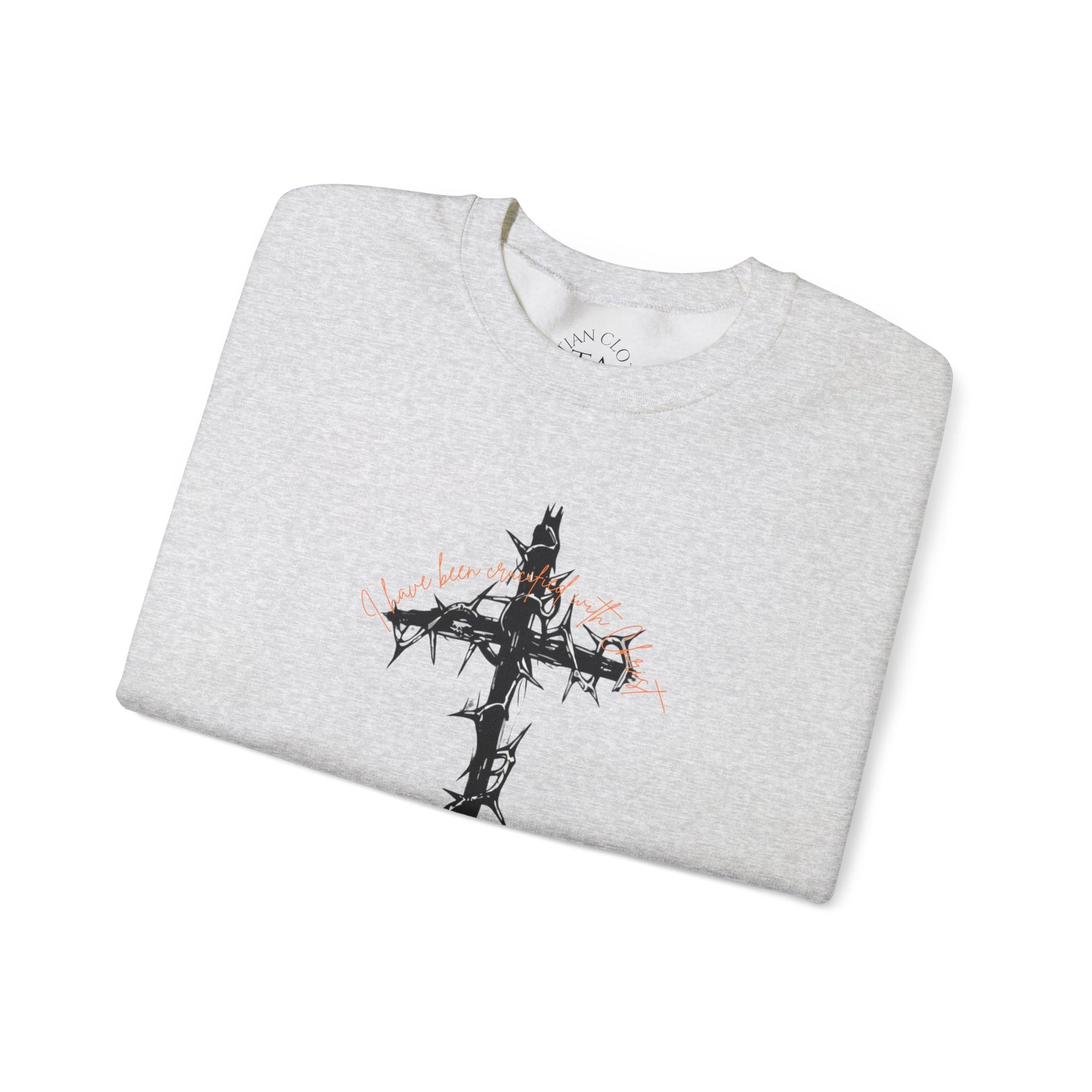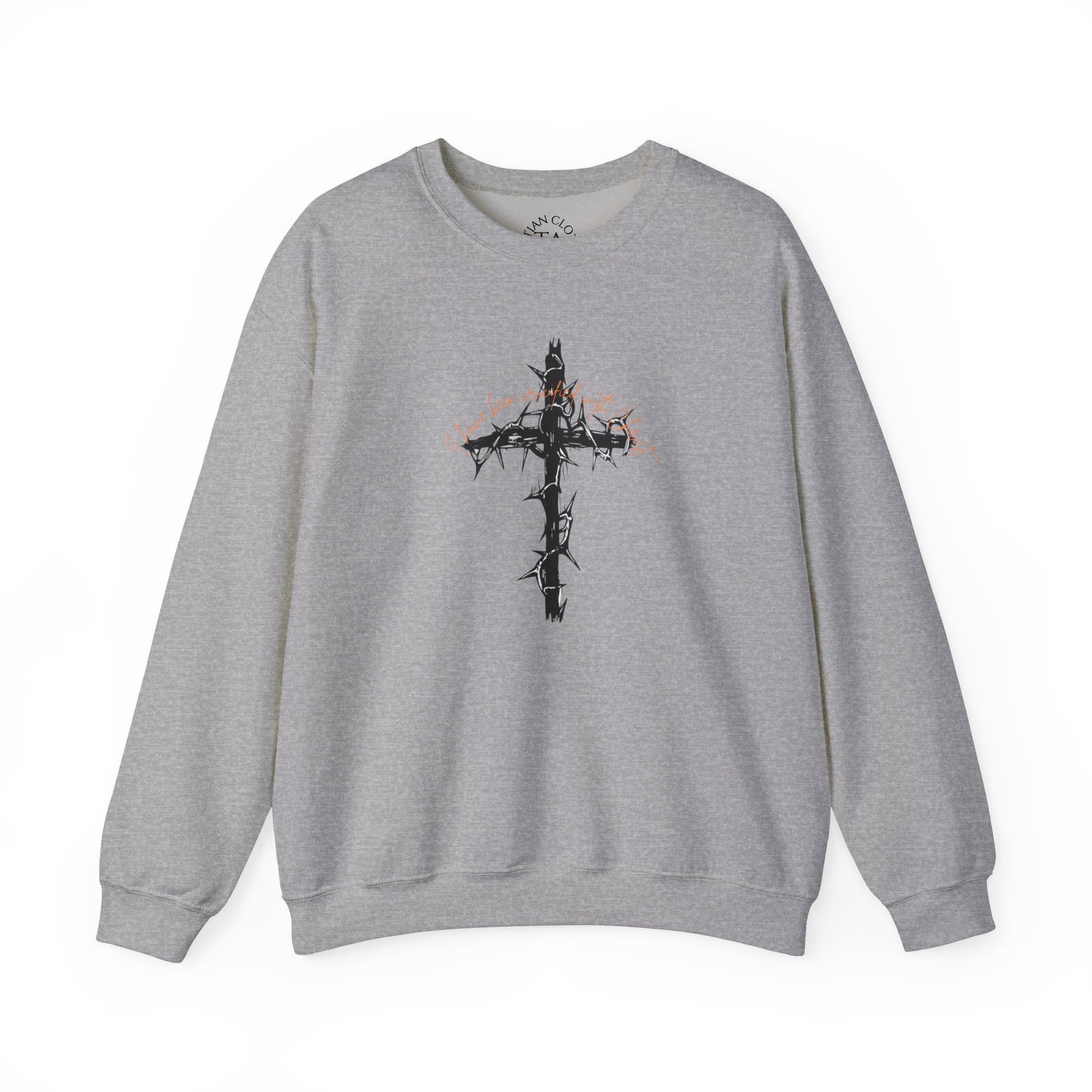 A faith-inspired sweatshirt featuring a barbed cross with 'I have been crucified with Christ' on the front and Galatians 2:20 on the back. This cozy and durable sweatshirt is perfect for chilly months and offers a comfortable wearing experience with a classic fit and crew neckline. Ideal for adults looking for a meaningful and stylish piece to wear during religious events, celebrations or everyday wear.