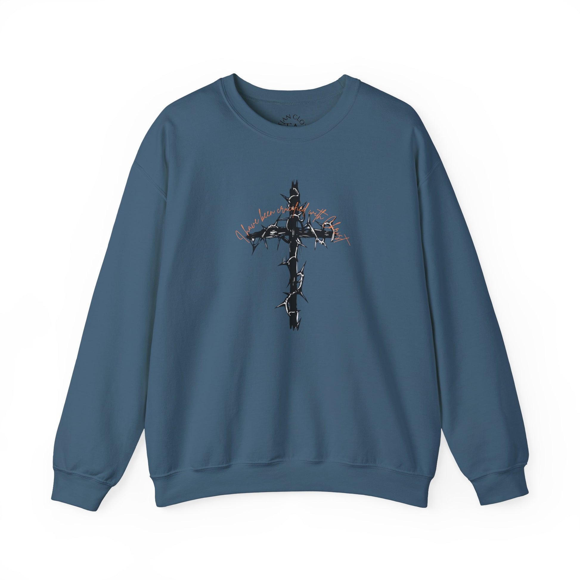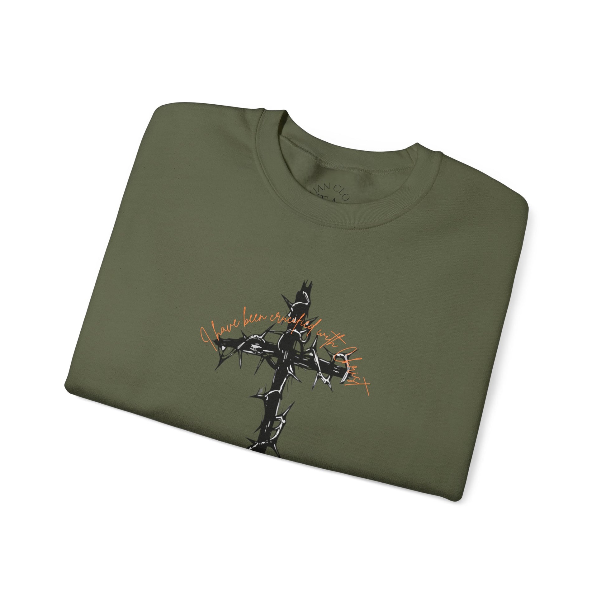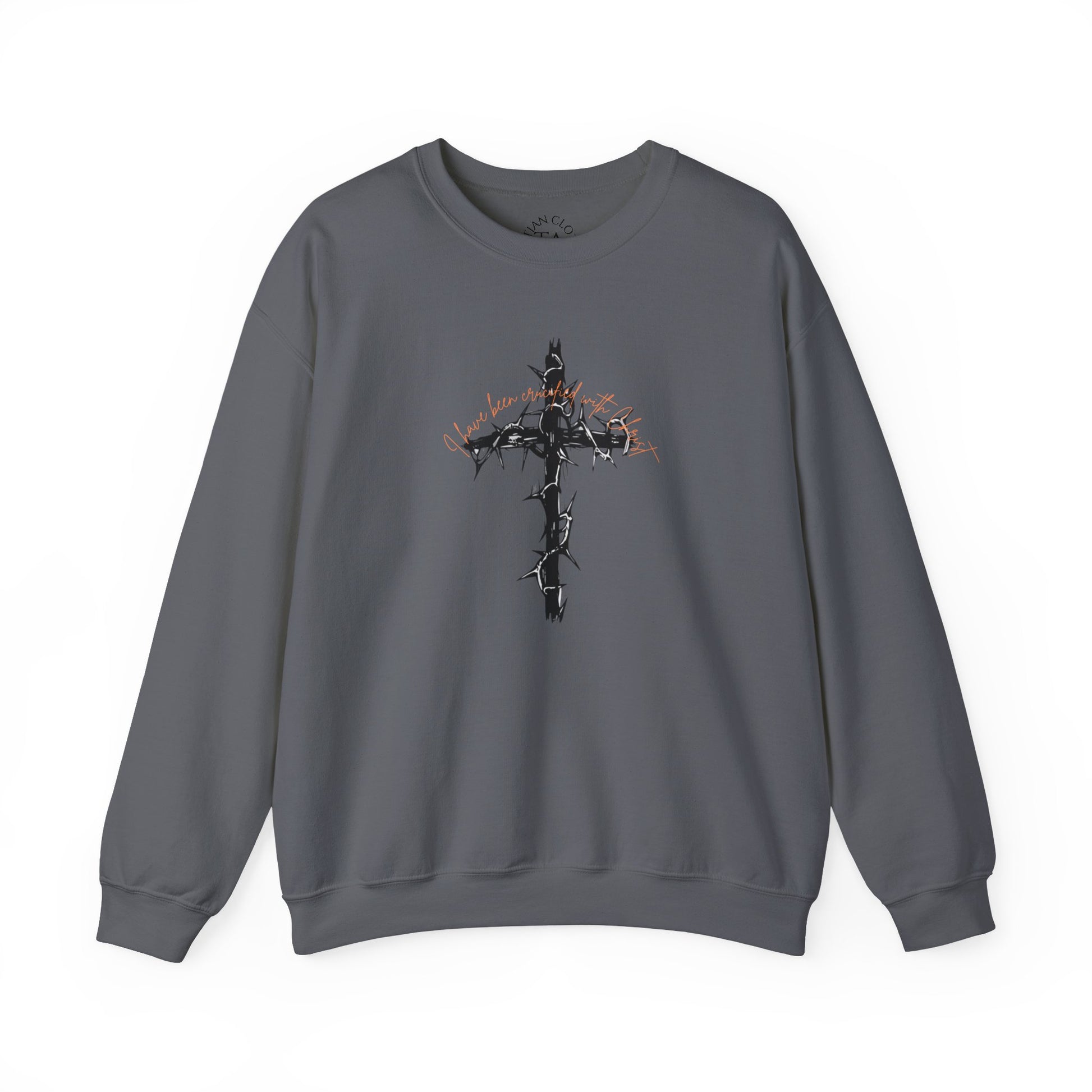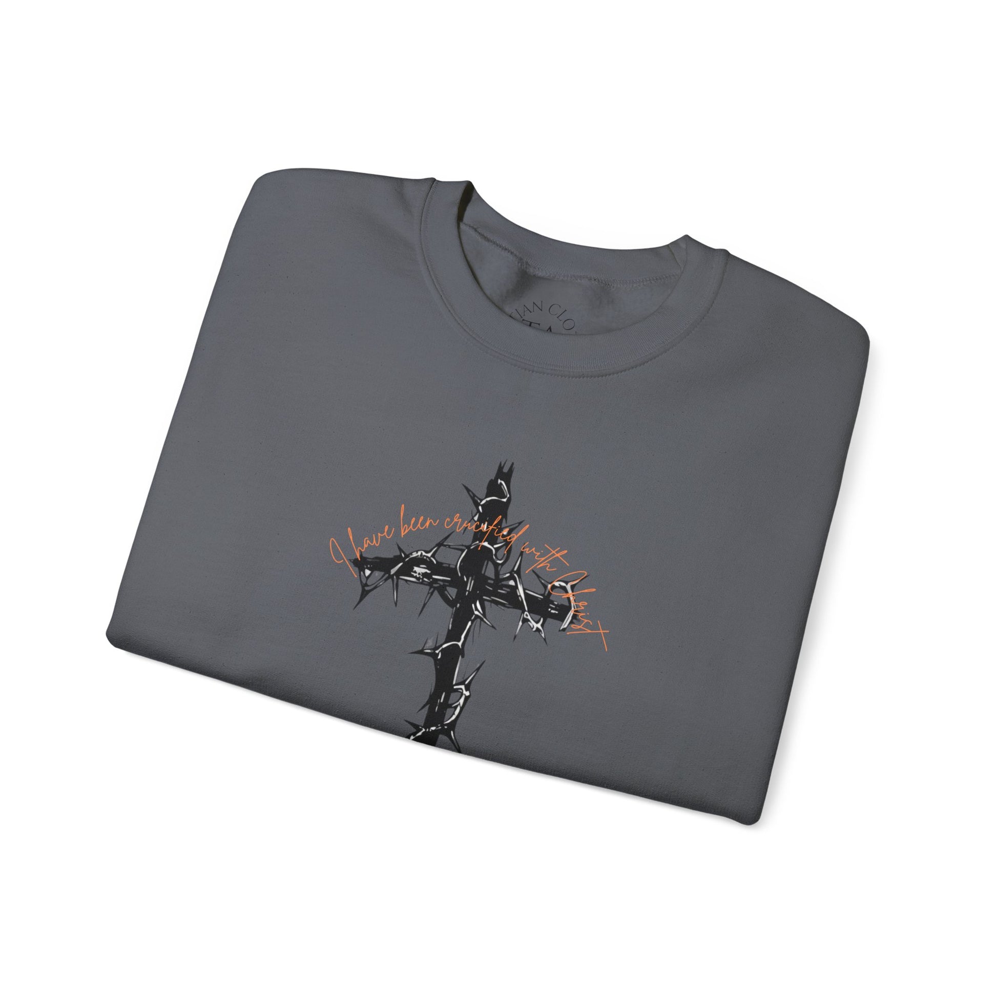 A faith-inspired sweatshirt featuring a barbed cross with 'I have been crucified with Christ' on the front and Galatians 2:20 on the back. This cozy and durable sweatshirt is perfect for chilly months and offers a comfortable wearing experience with a classic fit and crew neckline. Ideal for adults looking for a meaningful and stylish piece to wear during religious events, celebrations or everyday wear.