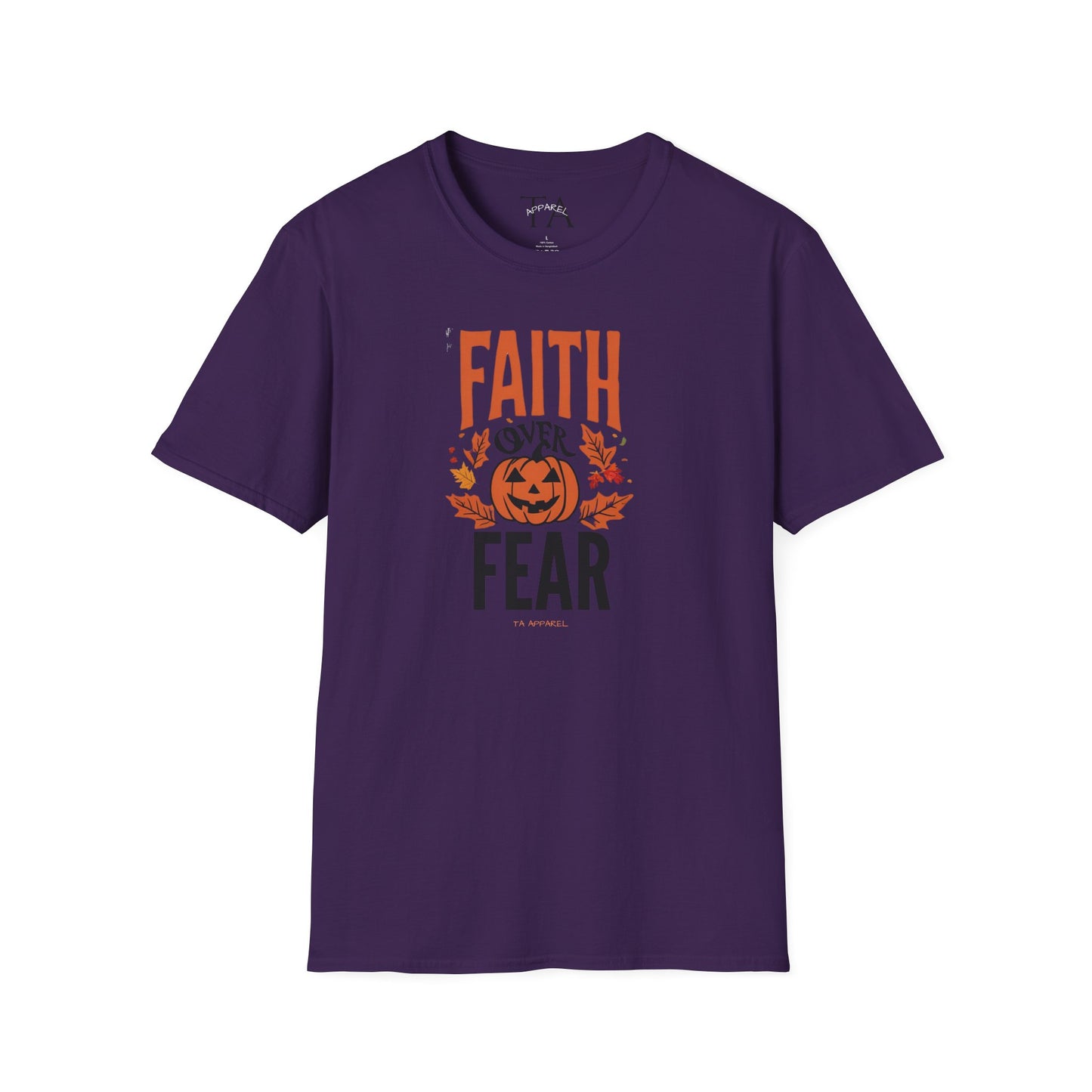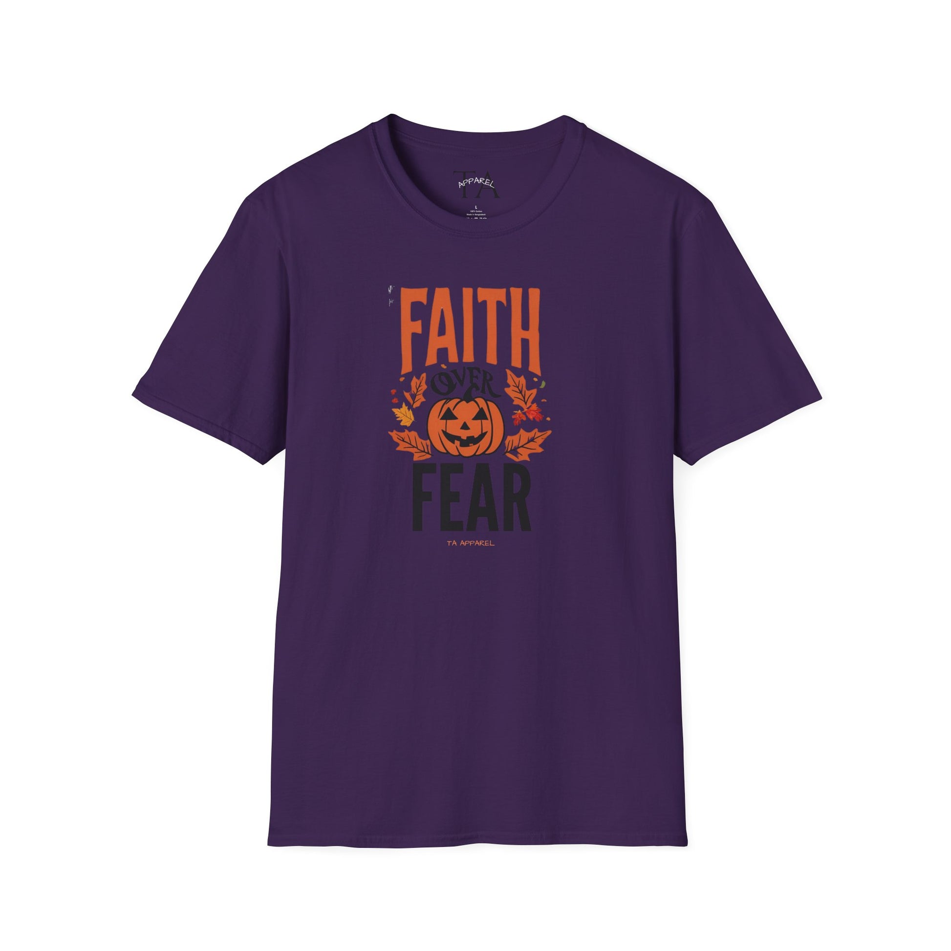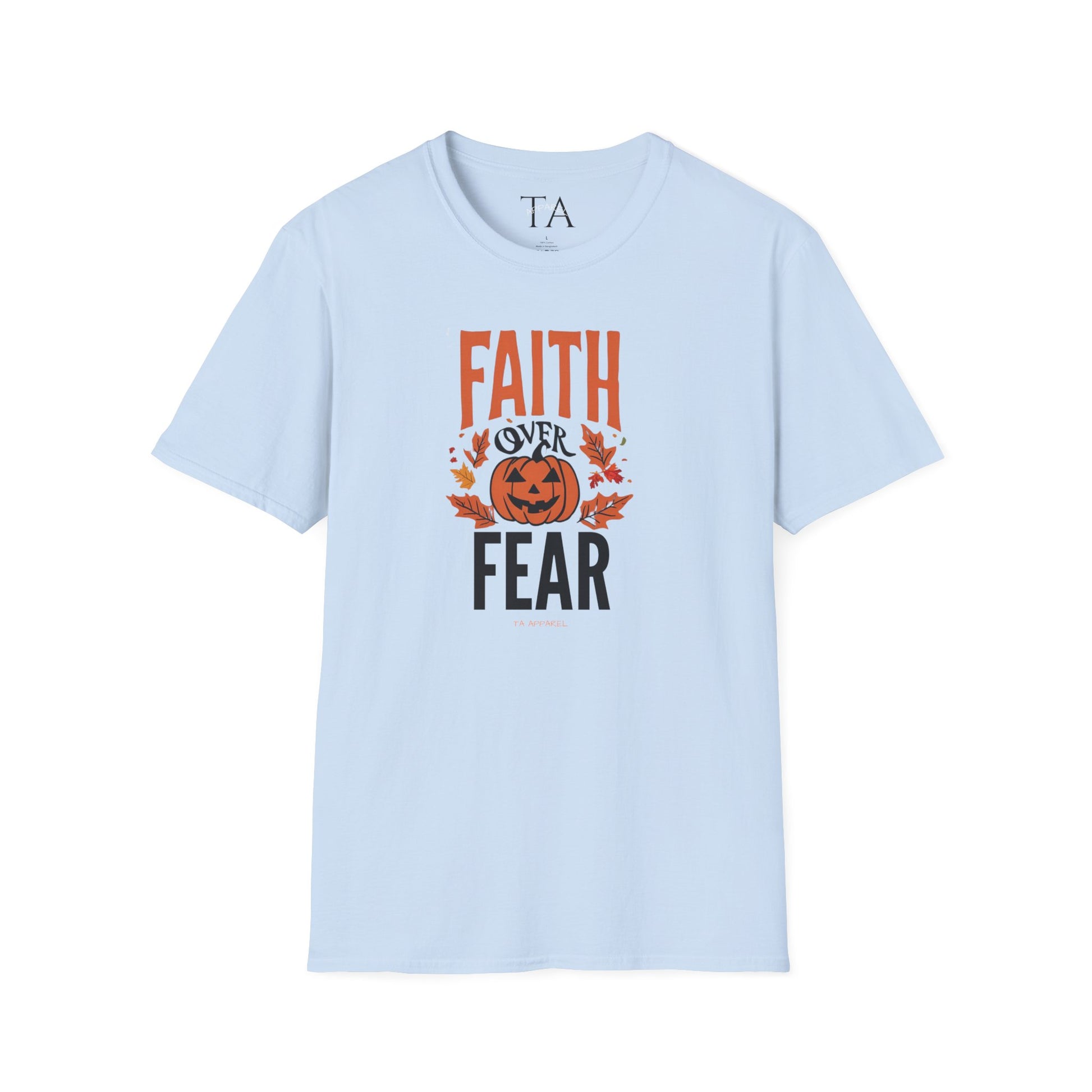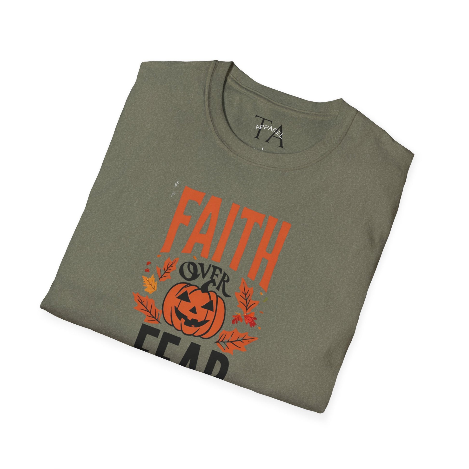 A faith-inspired 'Faith Over Fear' Halloween unisex t-shirt, perfect for fall fashion. This spiritual message shirt exudes a positive vibe and is relevant for those celebrating Halloween with a touch of faith. The classic fit and versatile style make it suitable for any occasion, adding a meaningful touch to the wearer's wardrobe.