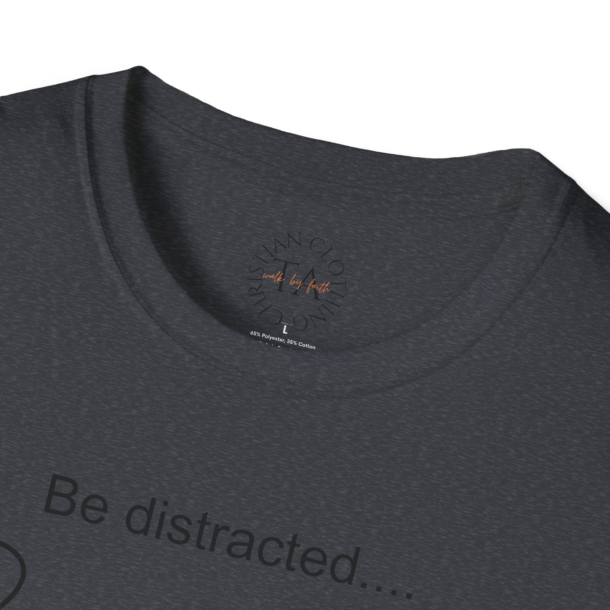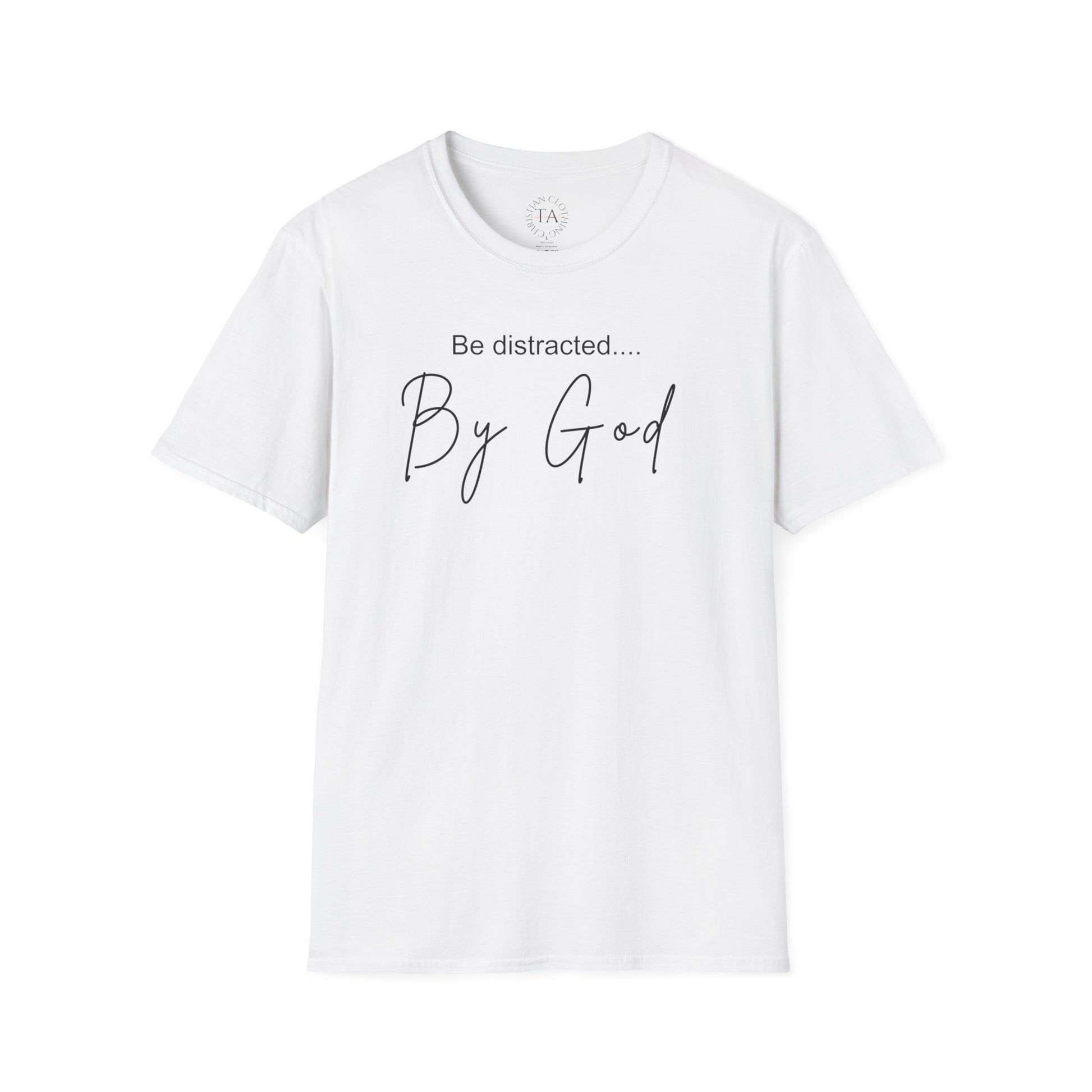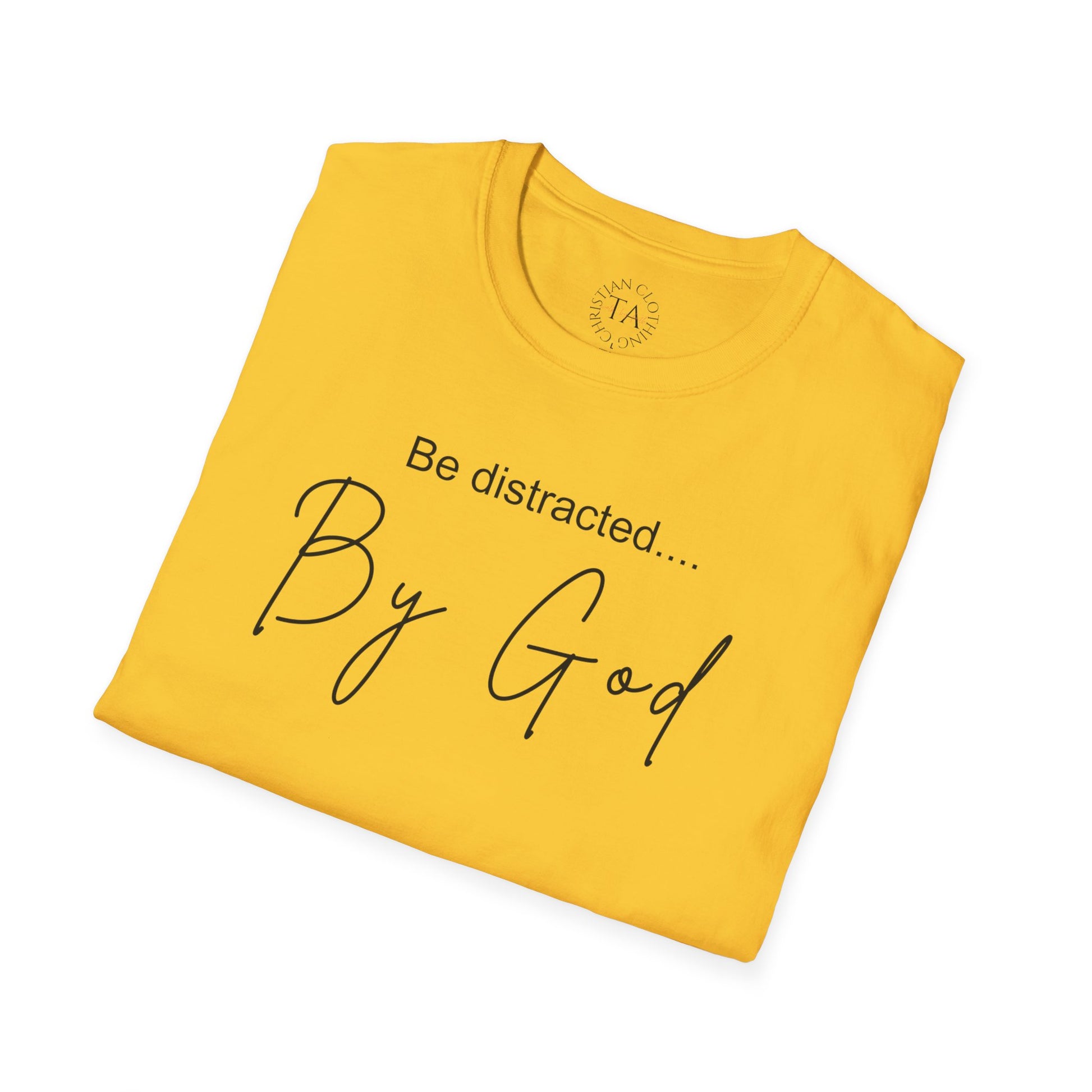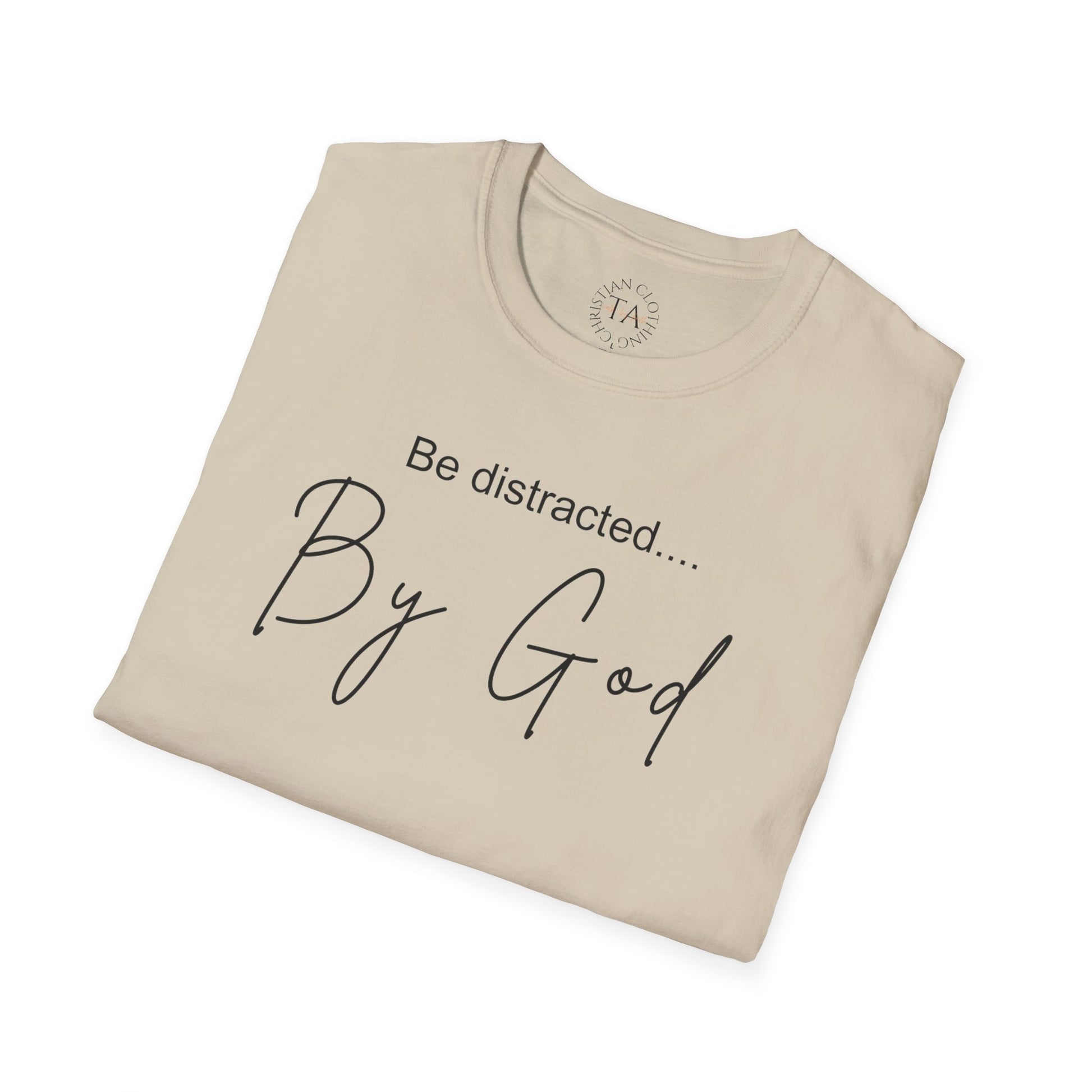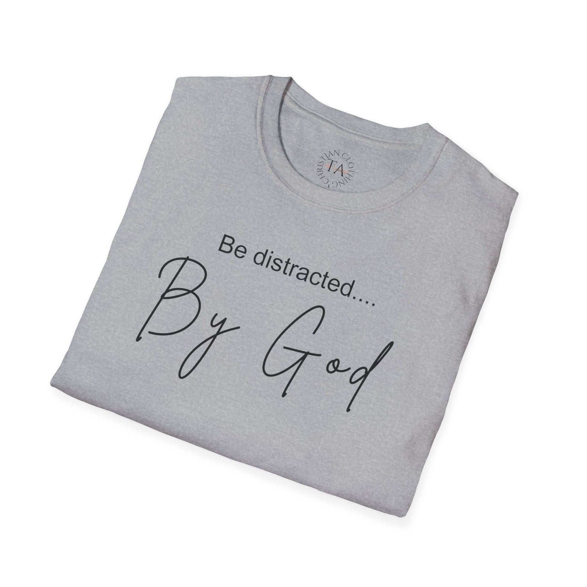 Faith-inspired t-shirt with "Be distracted by God" saying, perfect for those looking to add a touch of spirituality to their wardrobe. Versatile style that can match any occasion, whether formal or semi-formal. Ideal for adults seeking a unique and meaningful piece of clothing. Relevant for religious holidays and spiritual observances.