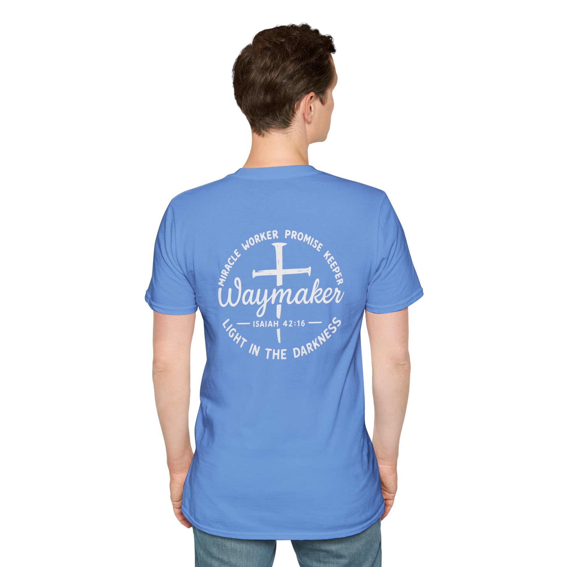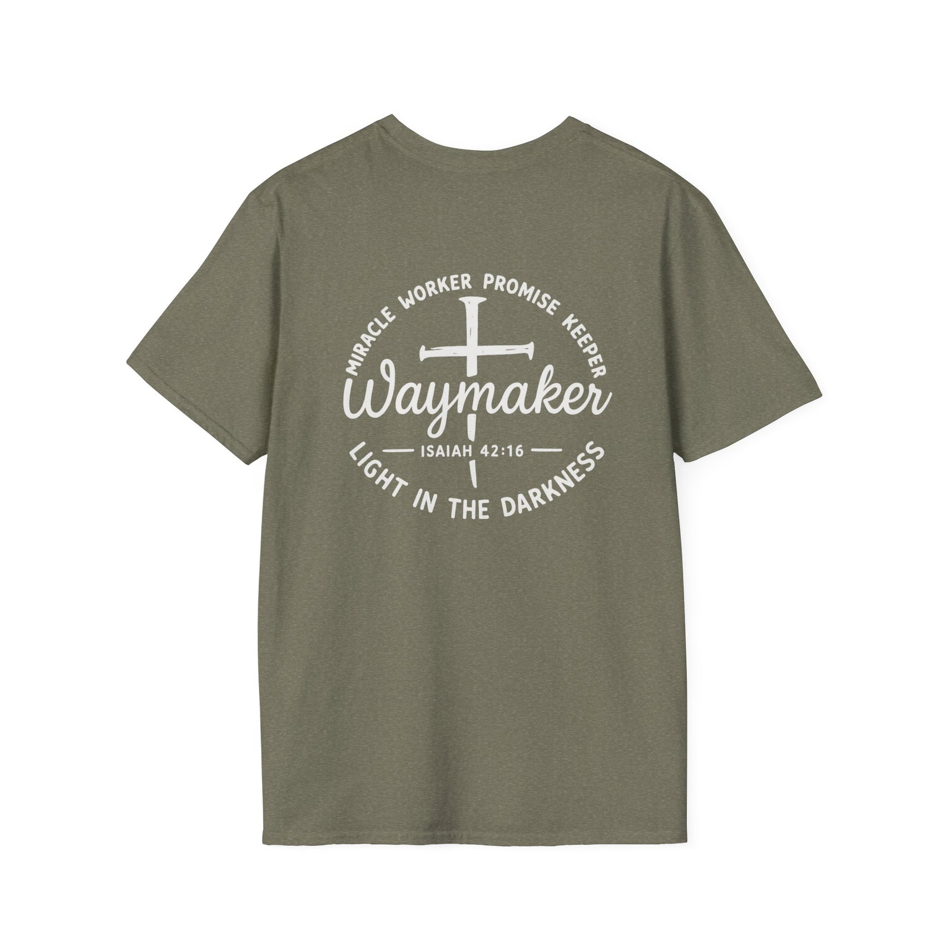 An inspirational Unisex Softstyle T-Shirt designed for Registered Nurses, featuring a Registered Nurse front design and a 'Waymaker' back design. This Christian graphic top is a perfect gift for nurses, exuding care and faith. The tee is perfect for everyday wear, spreading positivity and inspiration wherever it goes. Ideal for nurses, Christians, and those who appreciate inspirational apparel. Perfect for gifting on Nurses Day, Christmas, birthdays, and other special occasions.