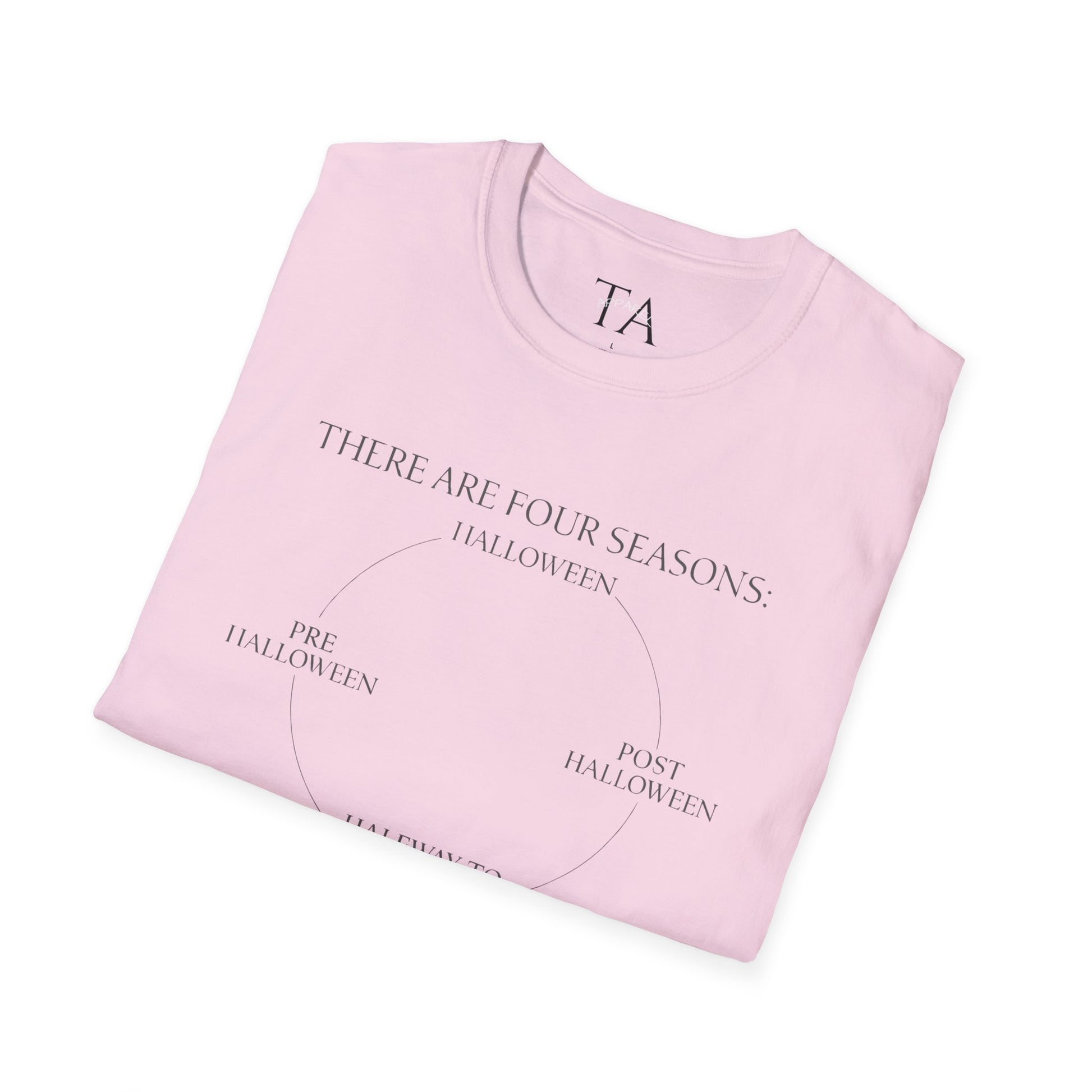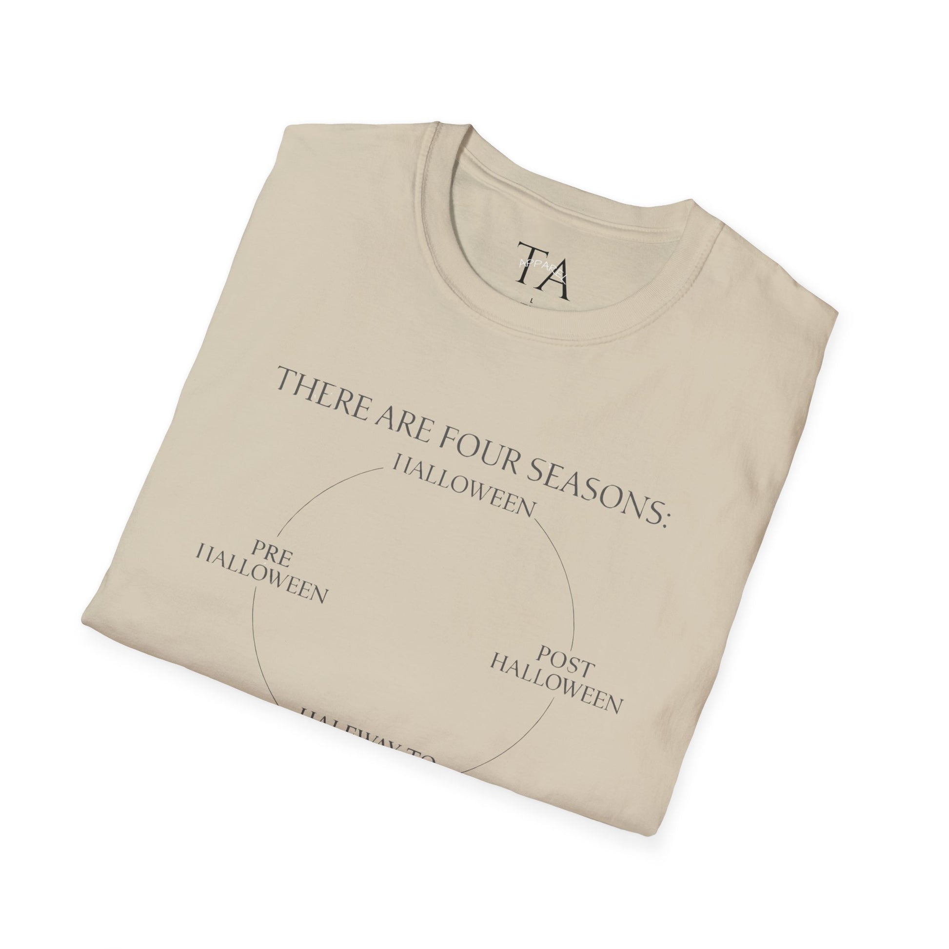 Halloween 4 Seasons T-Shirt, Minimalist Tee, perfect for Halloween lovers. A sustainable fashion piece suitable for casual wear. Great as a gift for any occasion.