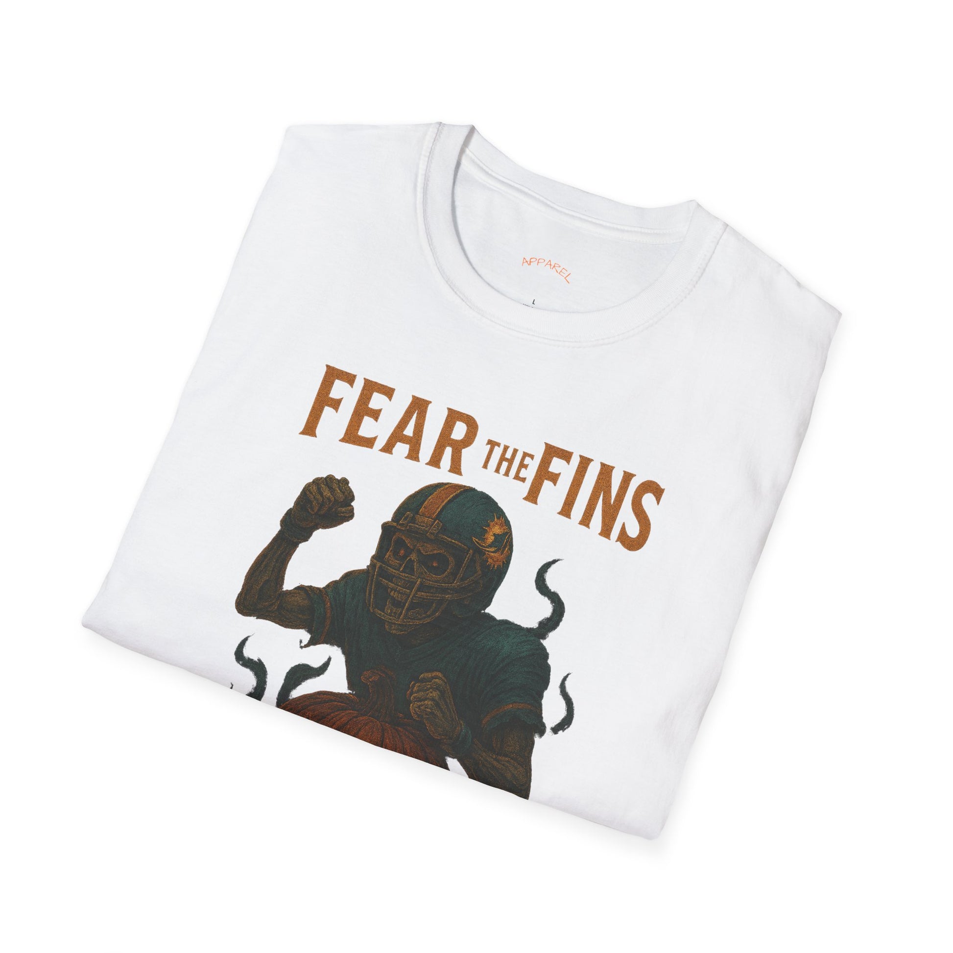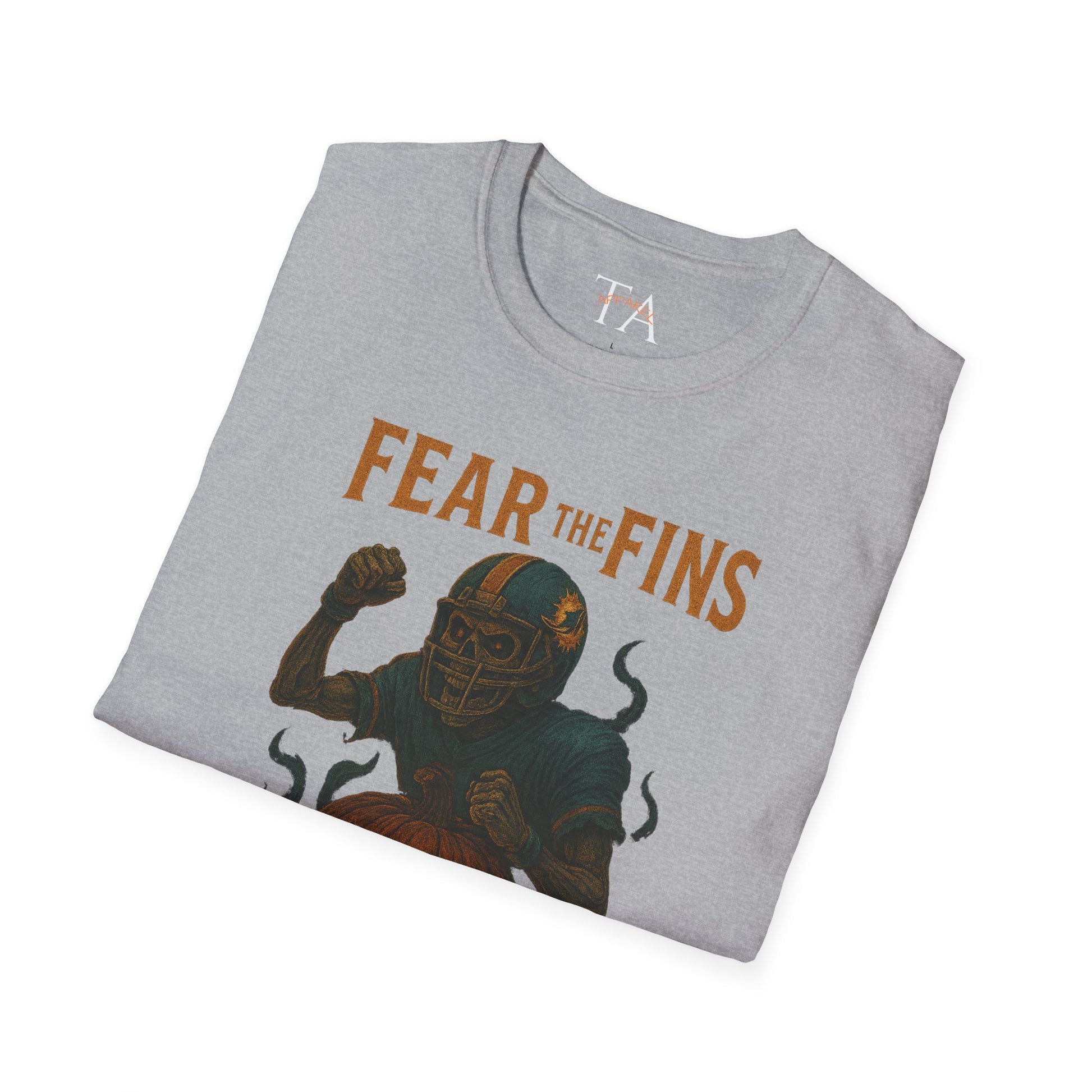 Get into the spooky spirit with this Halloween Fear the Fins T-Shirt. Perfect for those who love horror-themed apparel, this graphic tee is a great choice for Halloween costumes or fall outfit. The pumpkin design adds a festive touch to your wardrobe, making it a fun gift for Halloween enthusiasts.