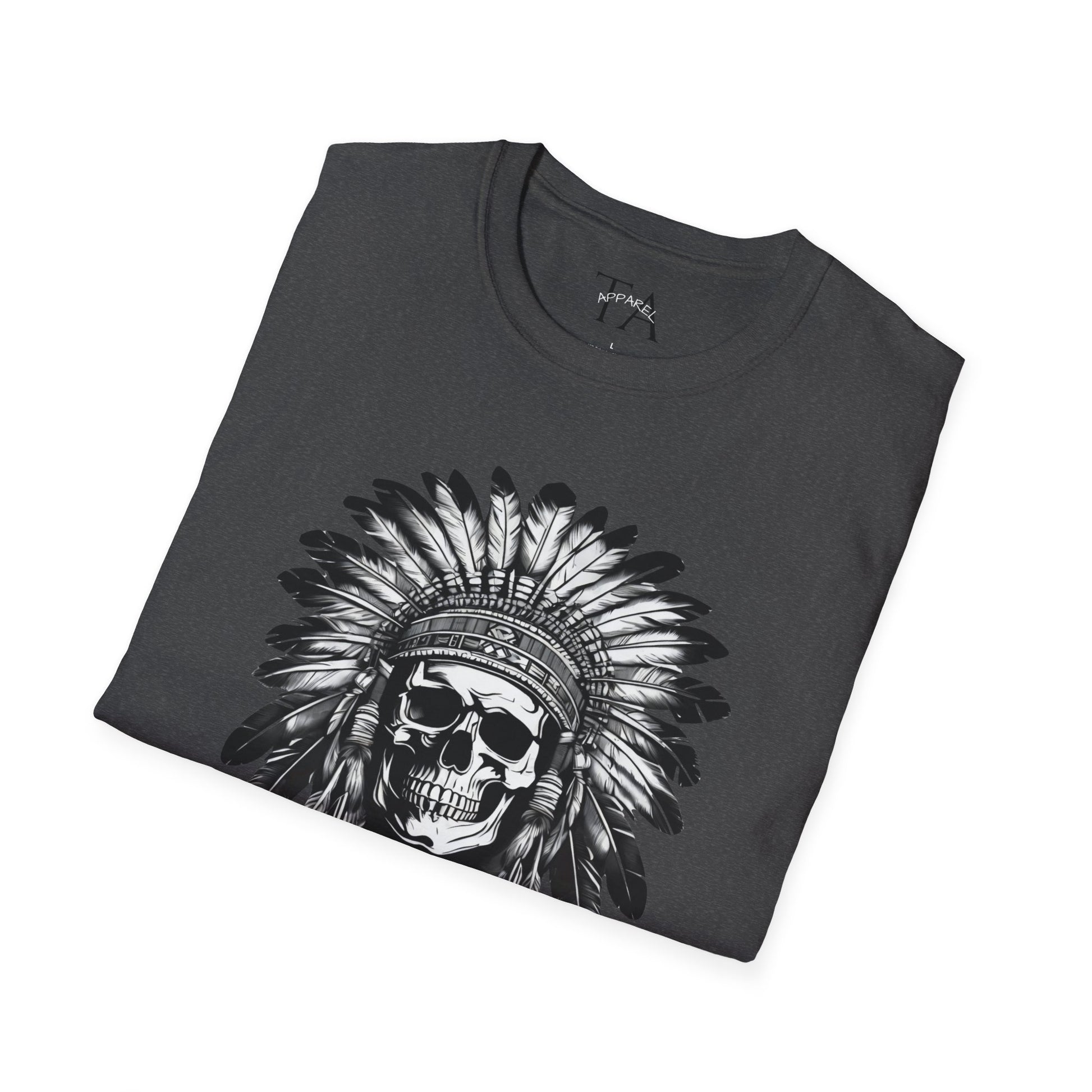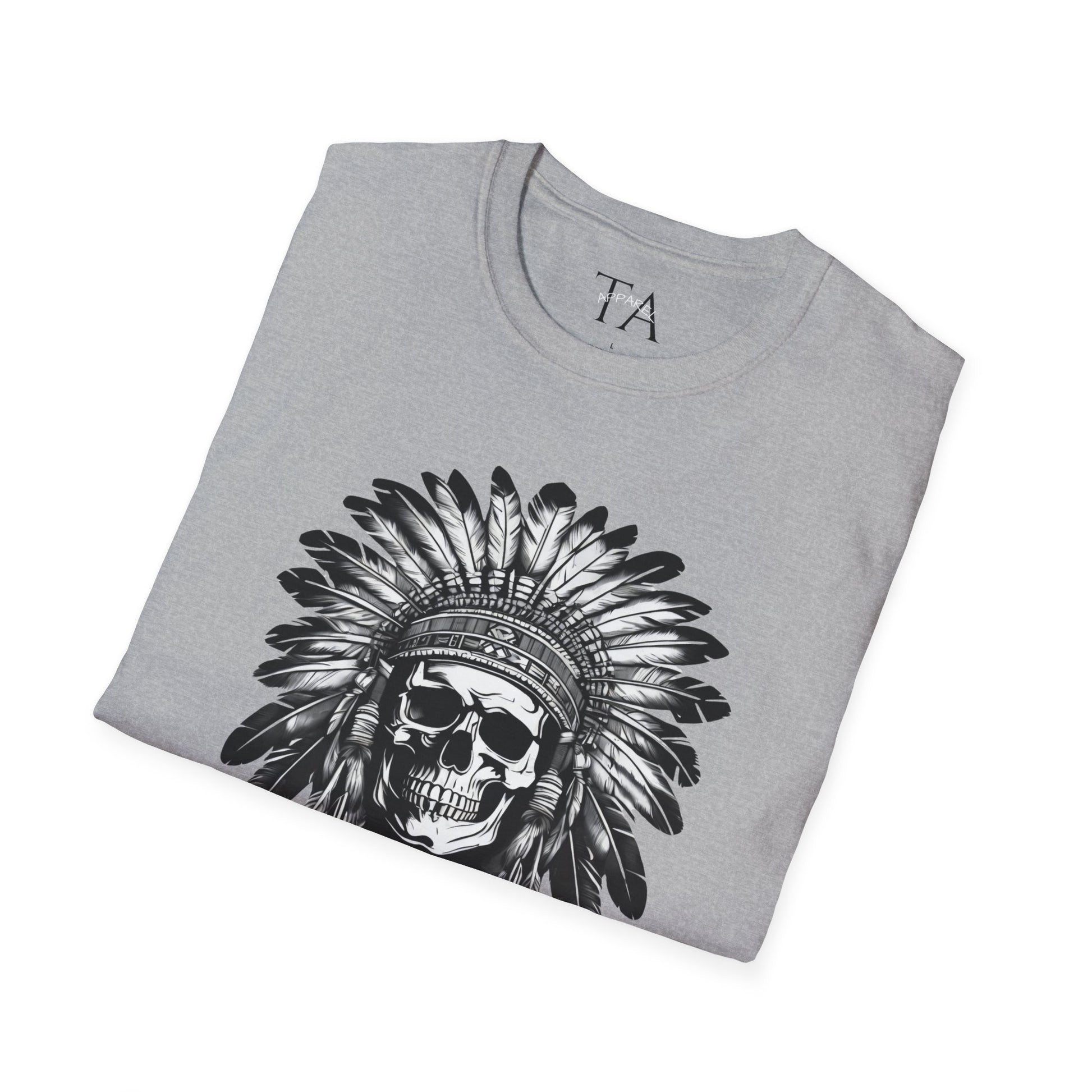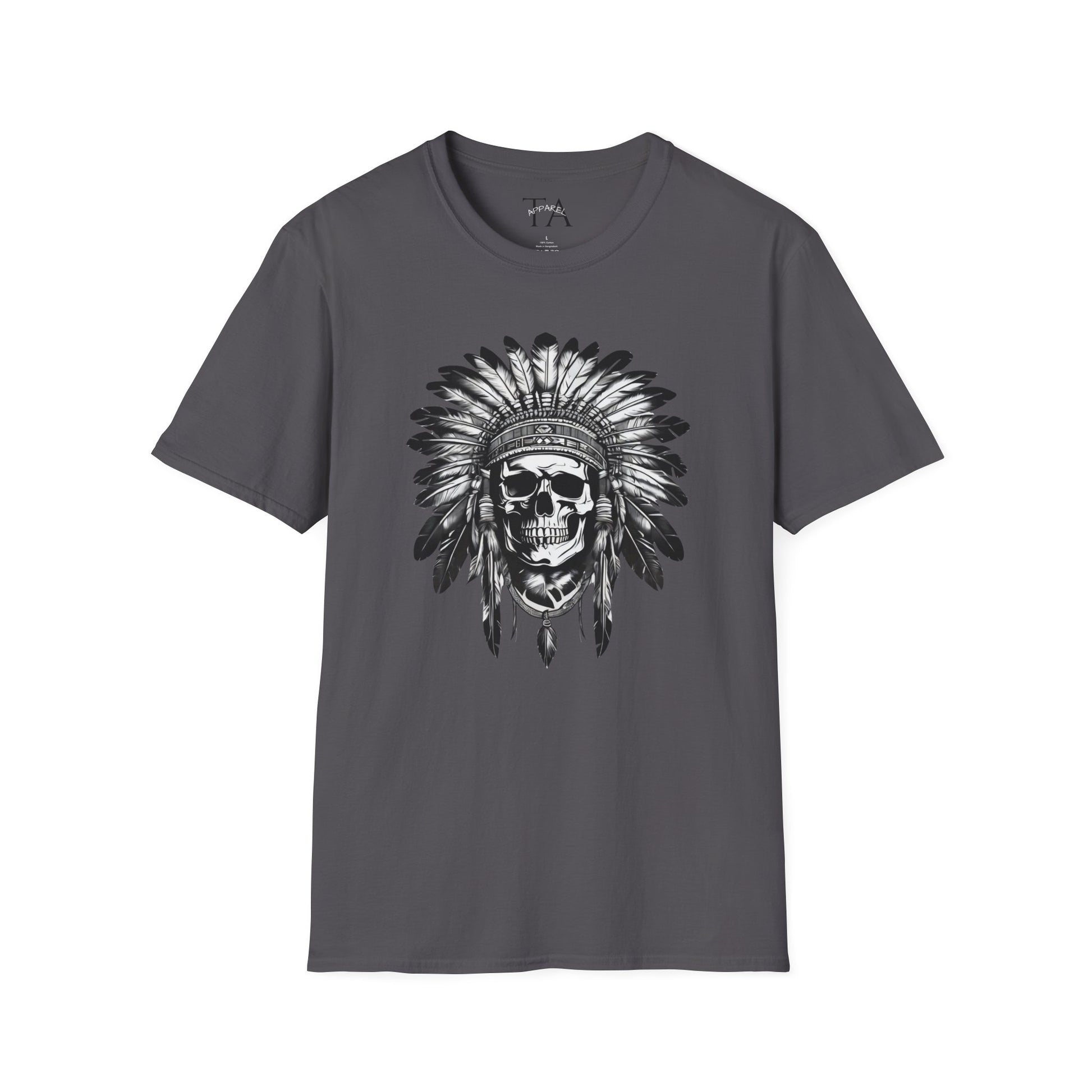 This Native American Skull Graphic T-Shirt is a versatile piece that can be worn as festival wear or as a casual streetwear style. Made from 100% ring-spun cotton, it offers a lightweight and durable fabric that is perfect for printing. The unisex softstyle tee features a classic fit with a crew neckline, making it suitable for any occasion. It is ideal for adults looking for a unique gift or a statement piece for their wardrobe.