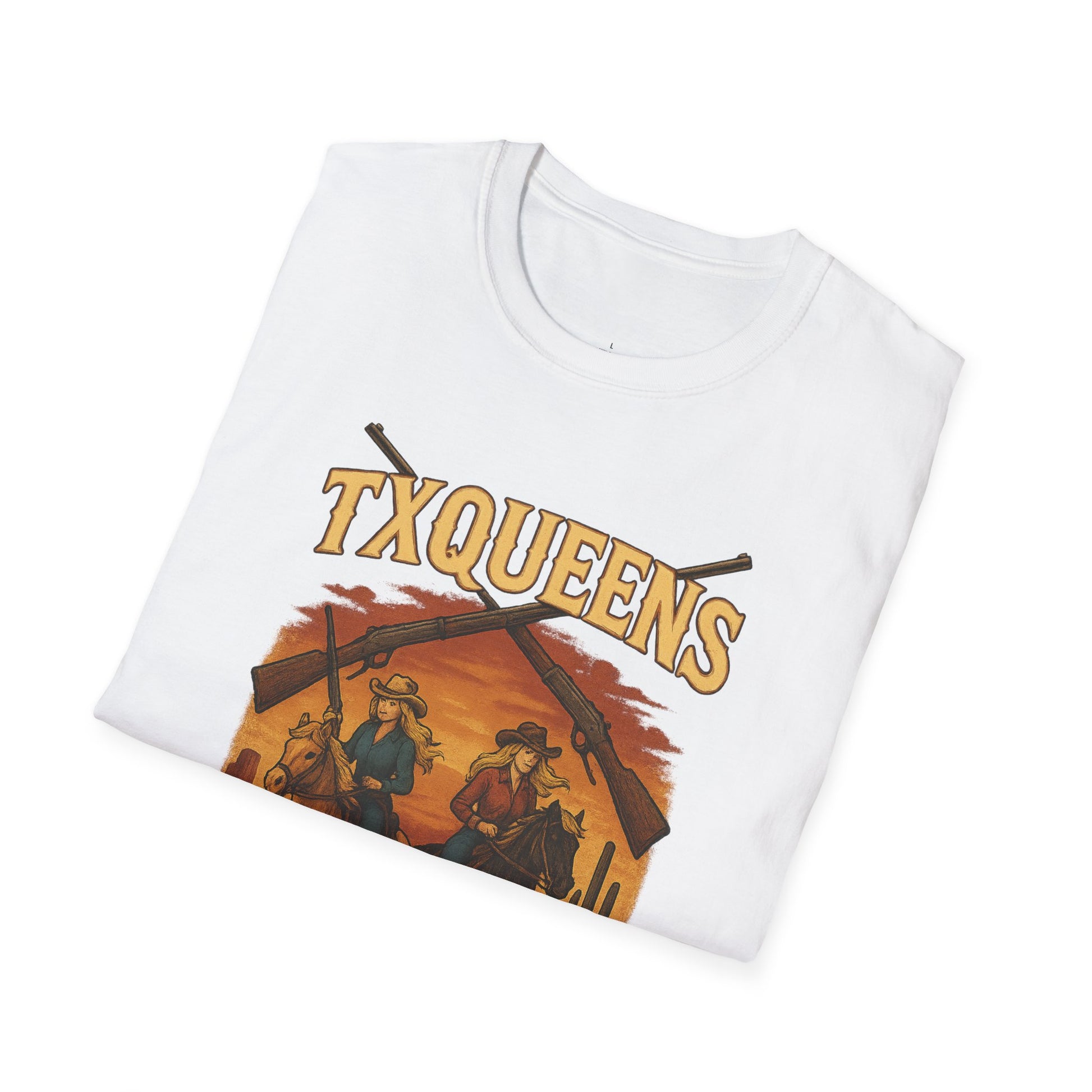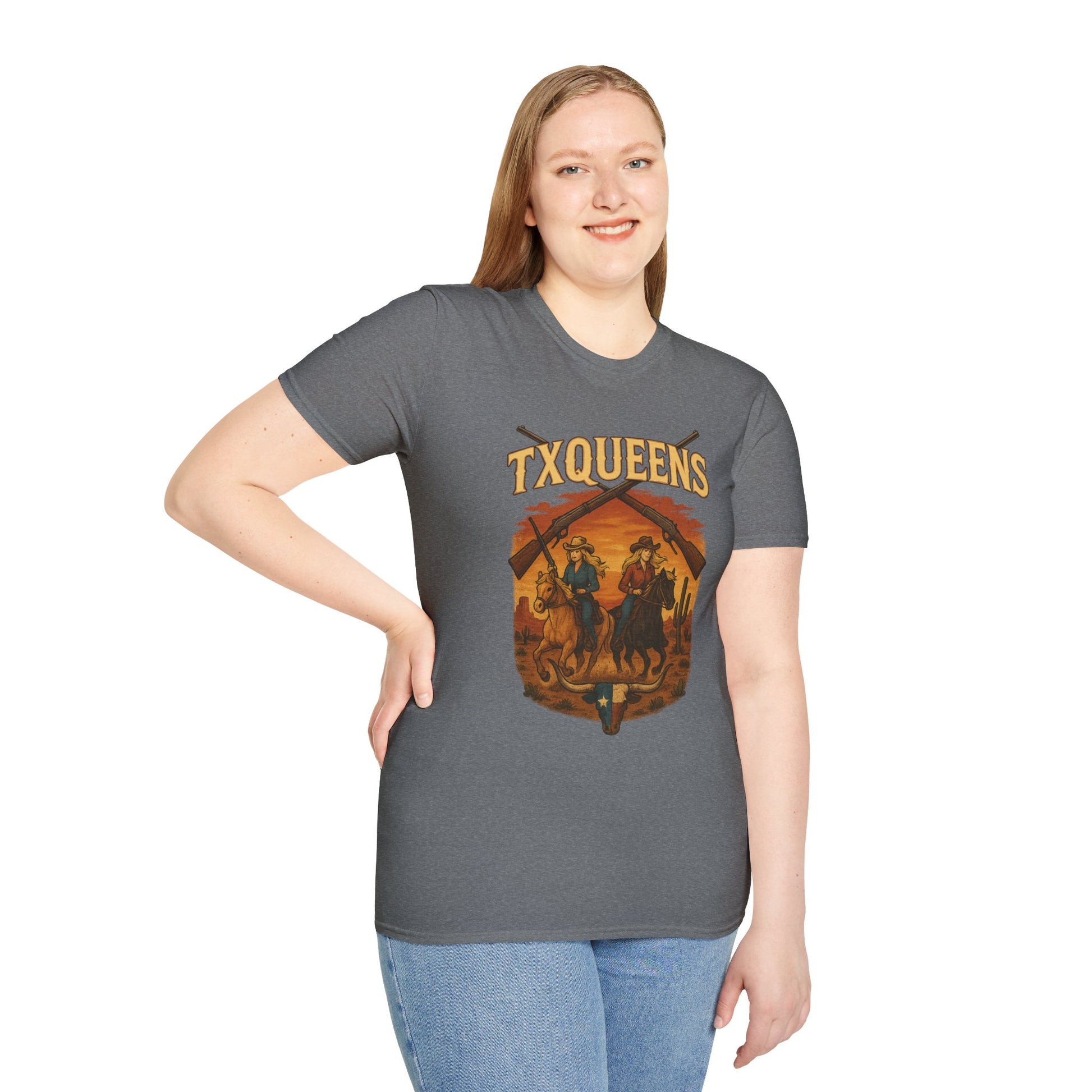 This TXQUEENS Unisex Softstyle T-Shirt is a trendy Western graphic tee perfect for cowgirls and rodeo lovers. Made from durable and smooth ring-spun cotton, this lightweight shirt is versatile for any occasion, from casual to semi-formal. It offers total wearing comfort with a classic fit and crew neckline.